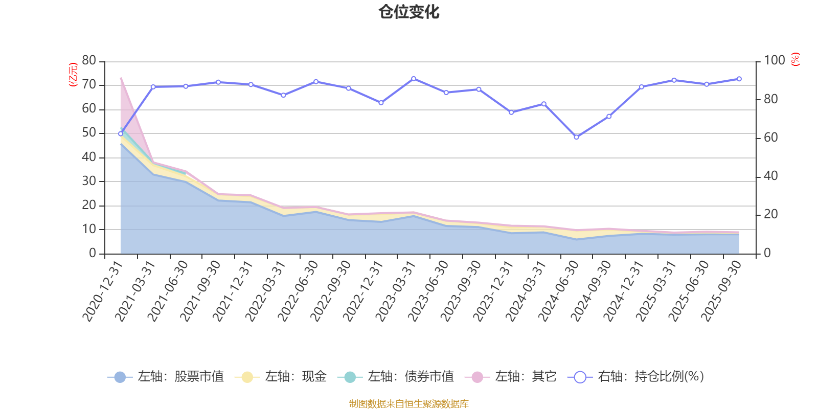据定期报告数据统计,近三年平均股票仓位为81.52%,同类平均为87.29%。2023年一季度末基金达到91.01%的最高仓位,2024年上半年末最低,为60.64%。