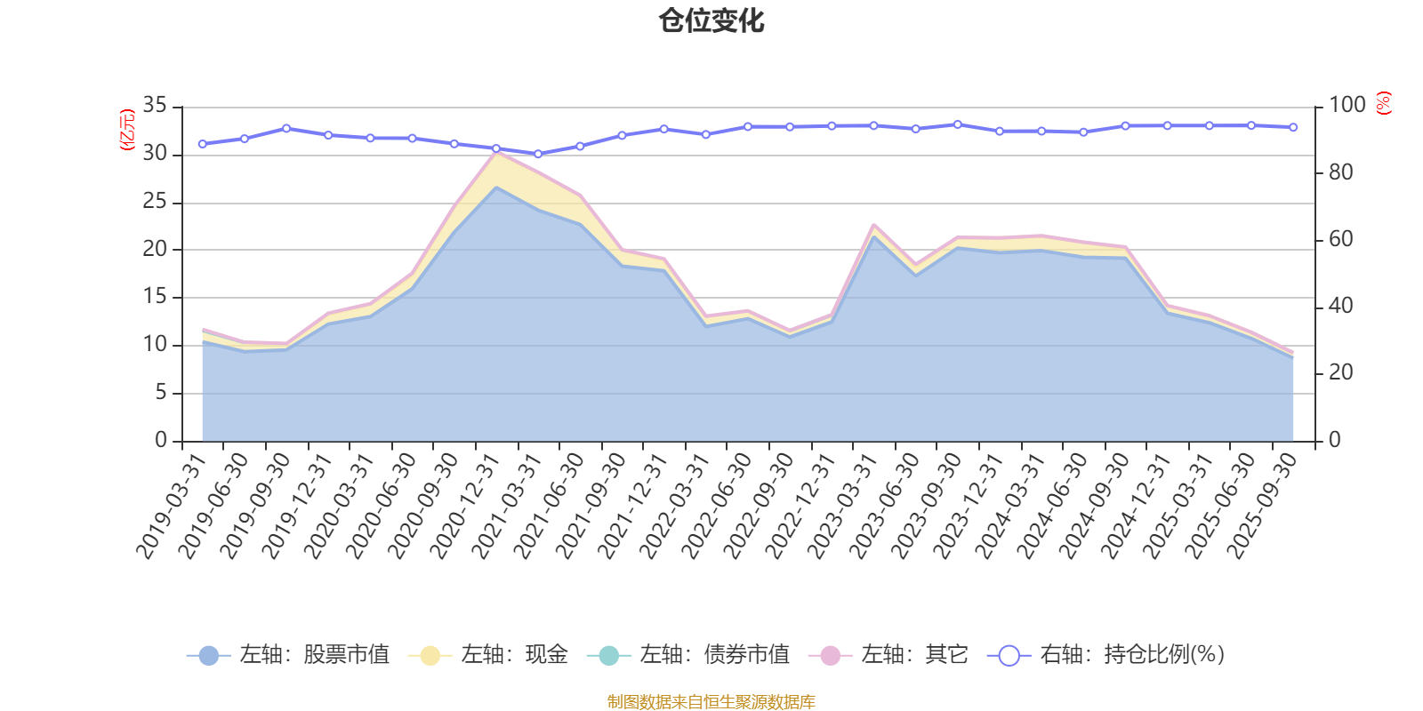 据定期报告数据统计,近三年平均股票仓位为93.79%,同类平均为72.35%。2023年三季度末基金达到94.7%的最高仓位,2021年一季度末最低,为85.87%。