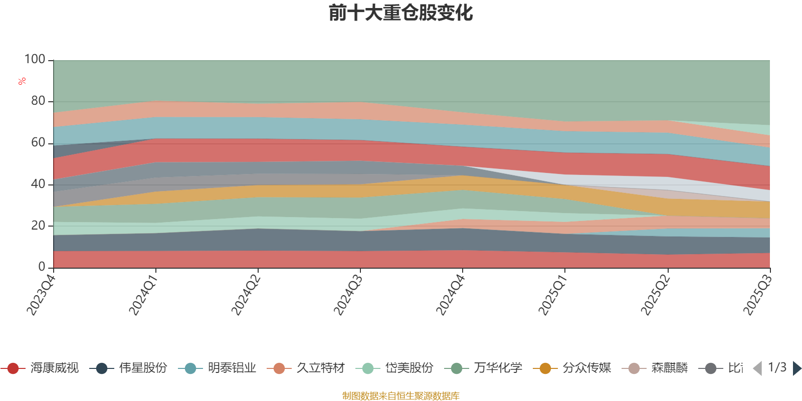 该基金持股集中度较高,近2年前十大重仓股集中度长期超过60%。截至2025年三季度末,基金十大重仓股分别是紫金矿业、美的集团、分众传媒、伟星股份、海康威视、继峰股份、杰克科技、三一重能、久立特材、明泰铝业。