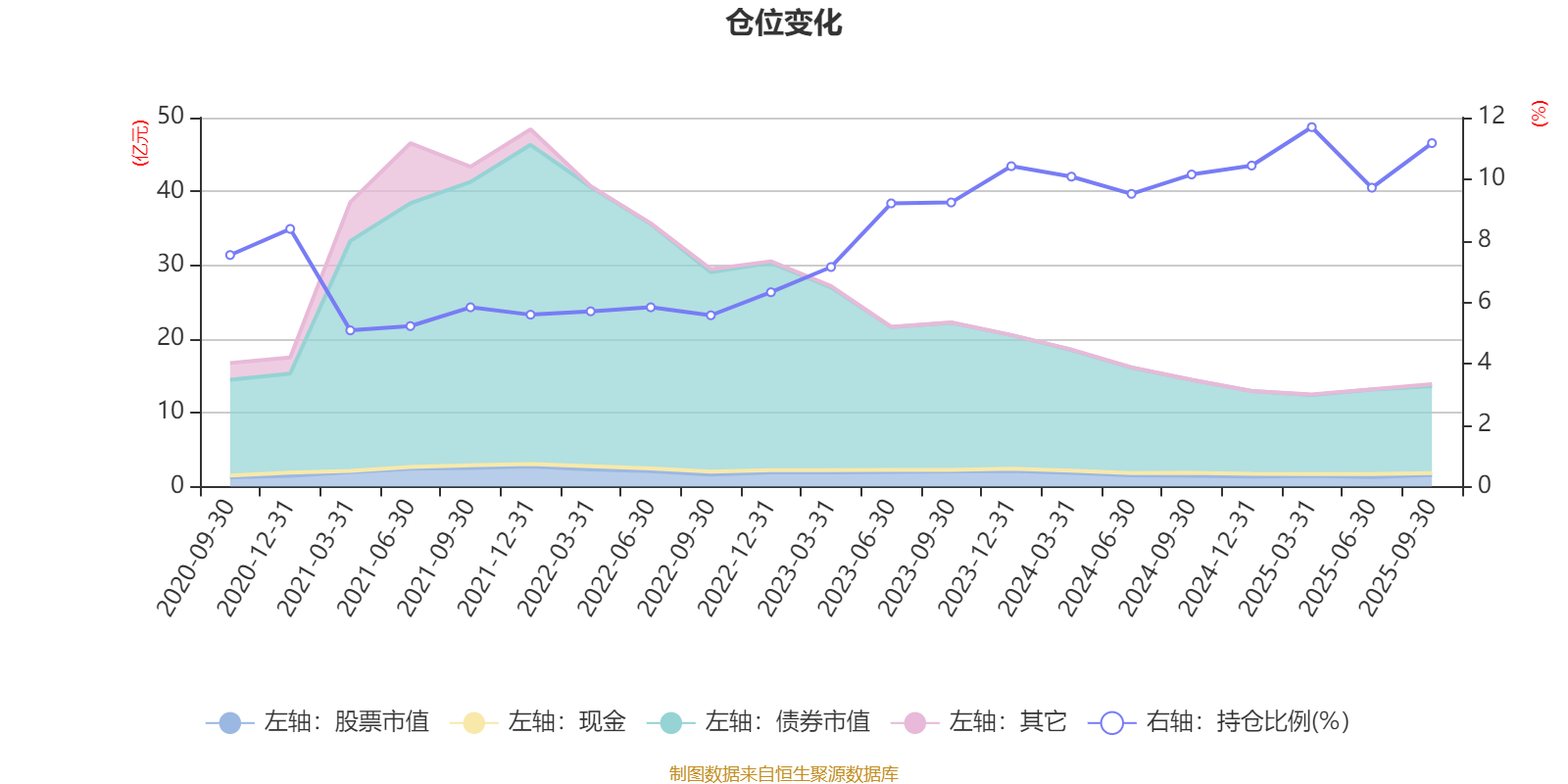据定期报告数据统计,近三年平均股票仓位为9.59%,同类平均为19.14%。2025年一季度末基金达到11.69%的最高仓位,2021年一季度末最低,为5.08%。