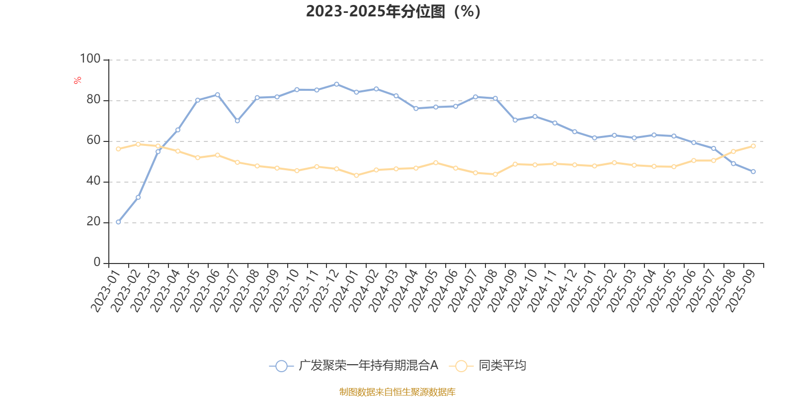 通过所选区间该基金净值增长率分位图,可以观察该基金与同类基金业绩比较情况。图为坐标原点到区间内某时点的净值增长率在同类基金中的分位数。