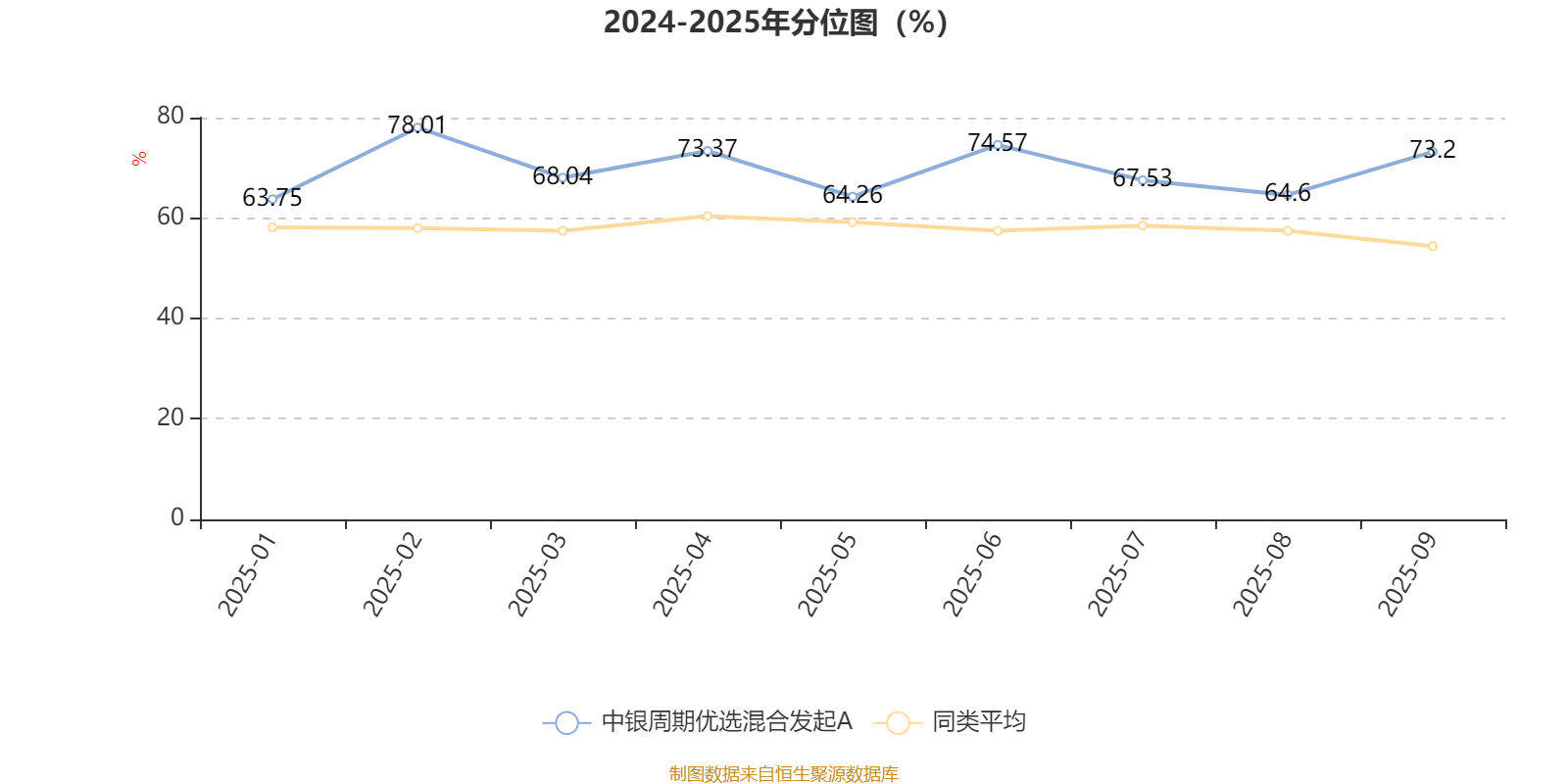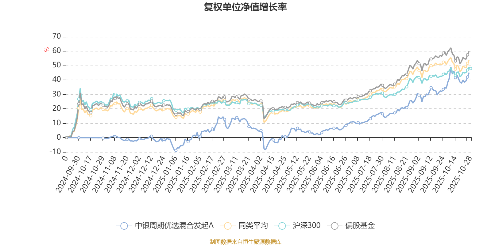 截至10月27日,中银周期优选混合发起A近三个月复权单位净值增长率为24.84%,位于同类可比基金140/689;近半年复权单位净值增长率为44.18%,位于同类可比基金121/688;近一年复权单位净值增长率为45.22%,位于同类可比基金120/653。