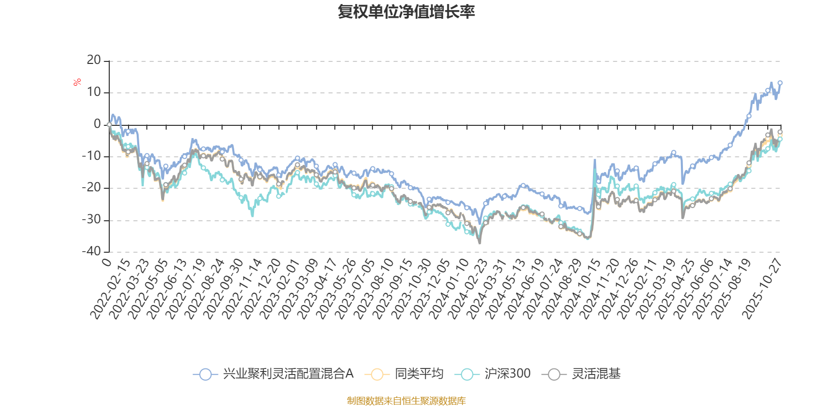 截至10月27日,兴业聚利灵活配置混合A近三个月复权单位净值增长率为16.93%,位于同类可比基金478/1287;近半年复权单位净值增长率为30.01%,位于同类可比基金484/1287;近一年复权单位净值增长率为33.85%,位于同类可比基金363/1287;近三年复权单位净值增长率为32.66%,位于同类可比基金303/1286。