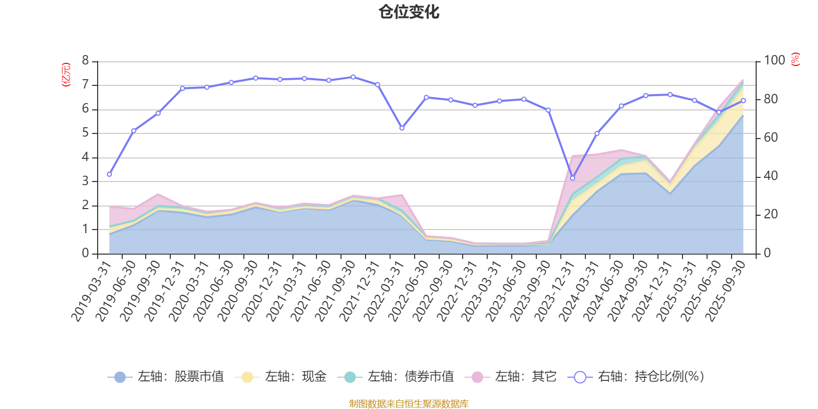 据定期报告数据统计,近三年平均股票仓位为74.01%,同类平均为72.35%。2021年三季度末基金达到91.87%的最高仓位,2023年末最低,为39.35%。