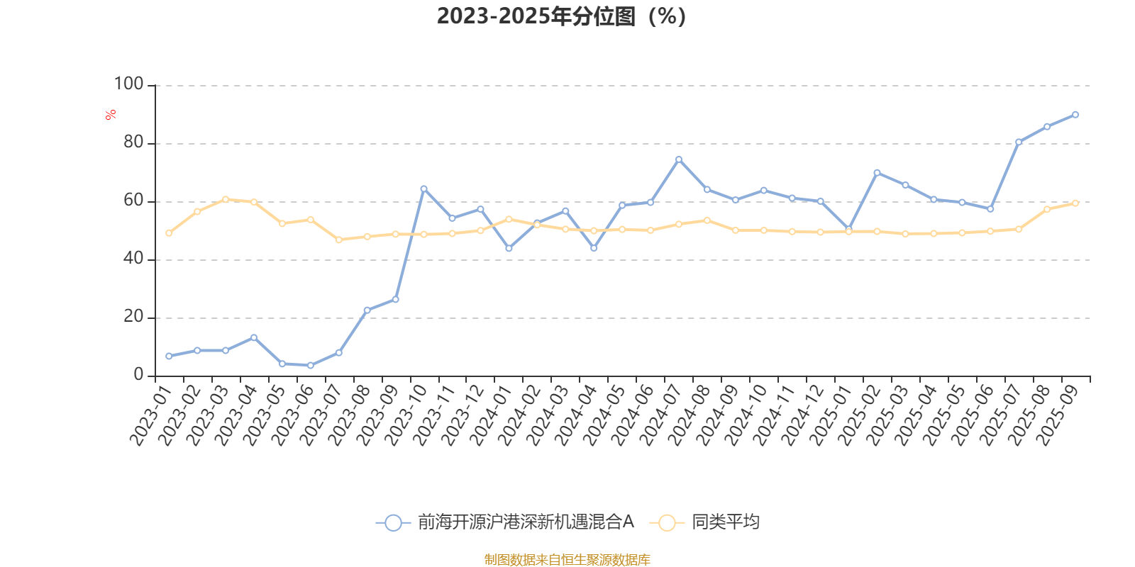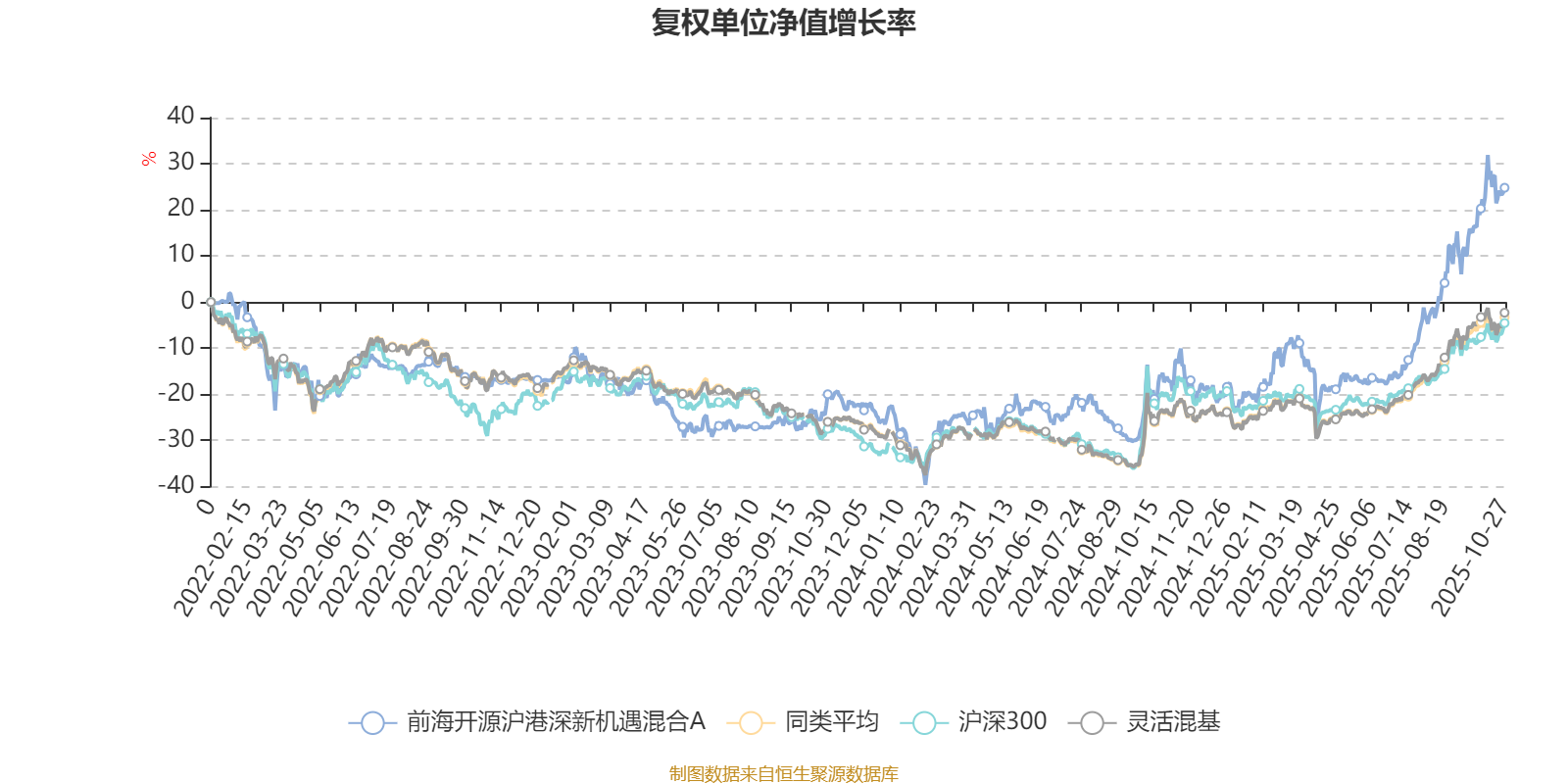截至10月27日,前海开源沪港深新机遇混合A近三个月复权单位净值增长率为31.44%,位于同类可比基金171/1287;近半年复权单位净值增长率为53.89%,位于同类可比基金129/1287;近一年复权单位净值增长率为50.08%,位于同类可比基金165/1287;近三年复权单位净值增长率为51.16%,位于同类可比基金136/1286。