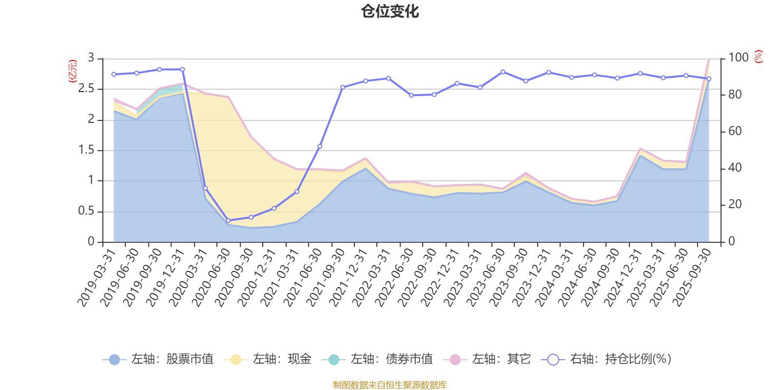据定期报告数据统计,近三年平均股票仓位为89.57%,同类平均为72.35%。2019年末基金达到94.07%的最高仓位,2020年上半年末最低,为11.75%。