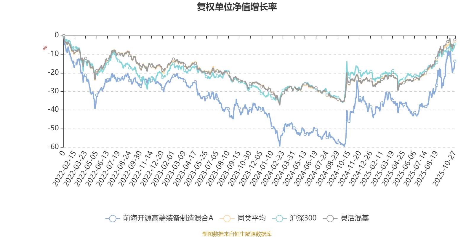 截至10月27日,前海开源高端装备制造混合A近三个月复权单位净值增长率为23.99%,位于同类可比基金302/1287;近半年复权单位净值增长率为37.20%,位于同类可比基金328/1287;近一年复权单位净值增长率为45.81%,位于同类可比基金201/1287;近三年复权单位净值增长率为14.37%,位于同类可比基金660/1286。