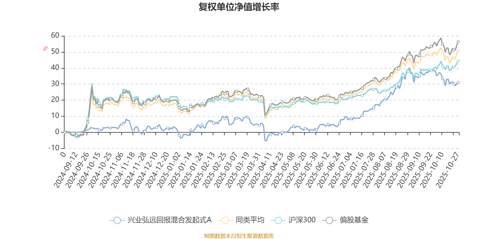 截至10月27日,兴业弘远回报混合发起式A近三个月复权单位净值增长率为14.50%,位于同类可比基金341/689;近半年复权单位净值增长率为30.69%,位于同类可比基金292/688;近一年复权单位净值增长率为27.67%,位于同类可比基金322/653。