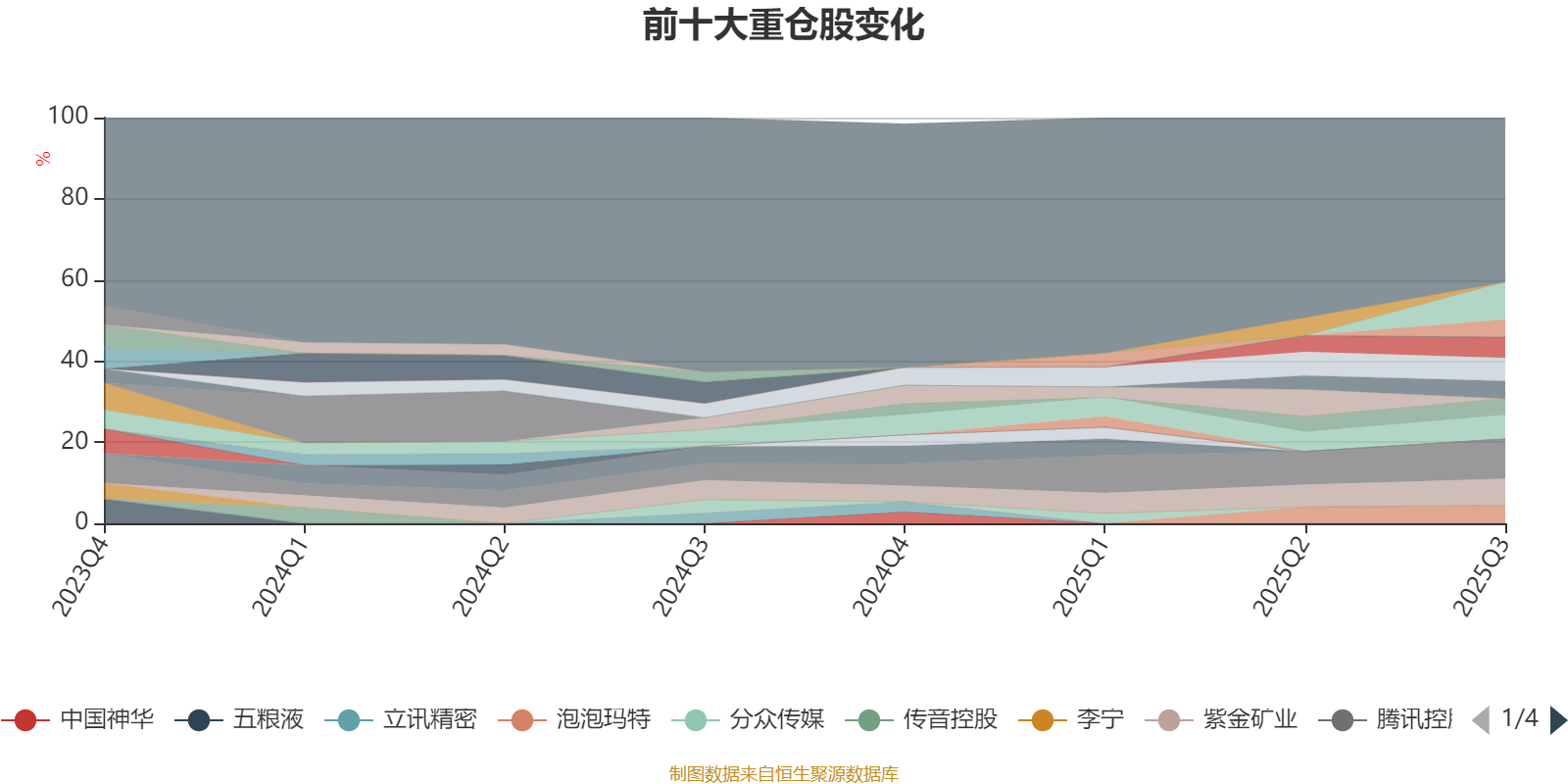 截至2025年三季度末,基金十大重仓股分别是腾讯控股、阿里巴巴-W、紫金矿业、宁德时代、恒瑞医药、中芯国际、泡泡玛特、亿纬锂能、同花顺、香港交易所。