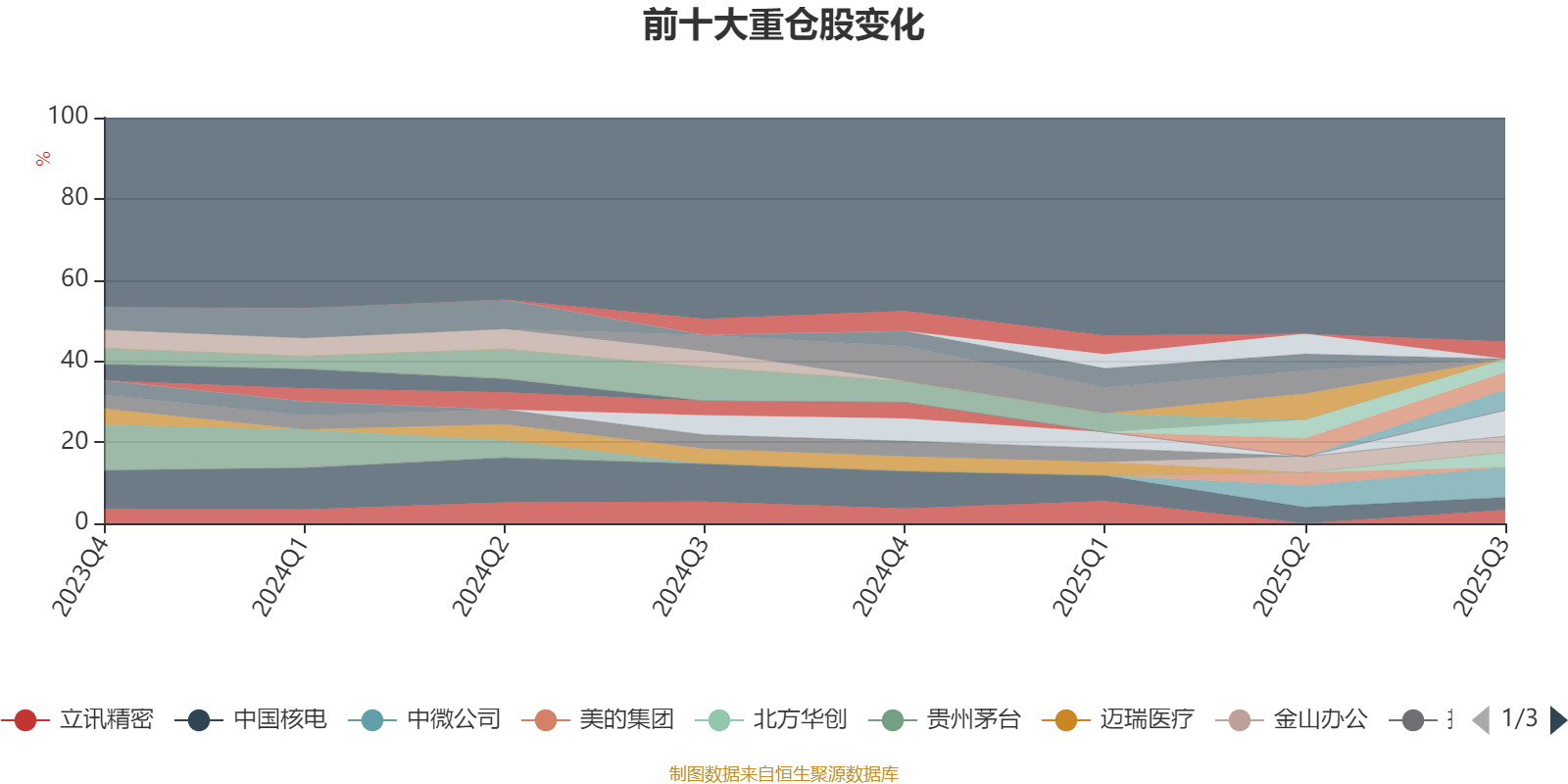 截至2025年三季度末,基金十大重仓股分别是中微公司、通富微电、豪威集团、恒瑞医药、双环传动、金山办公、北方华创、招商公路、立讯精密、中国核电。