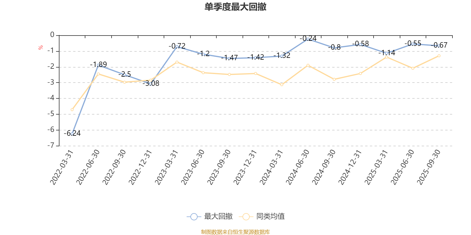 截至10月27日,基金近三年最大回撤为2.59%,同类可比基金排名41/535。单季度最大回撤出现在2022年一季度,为6.24%。