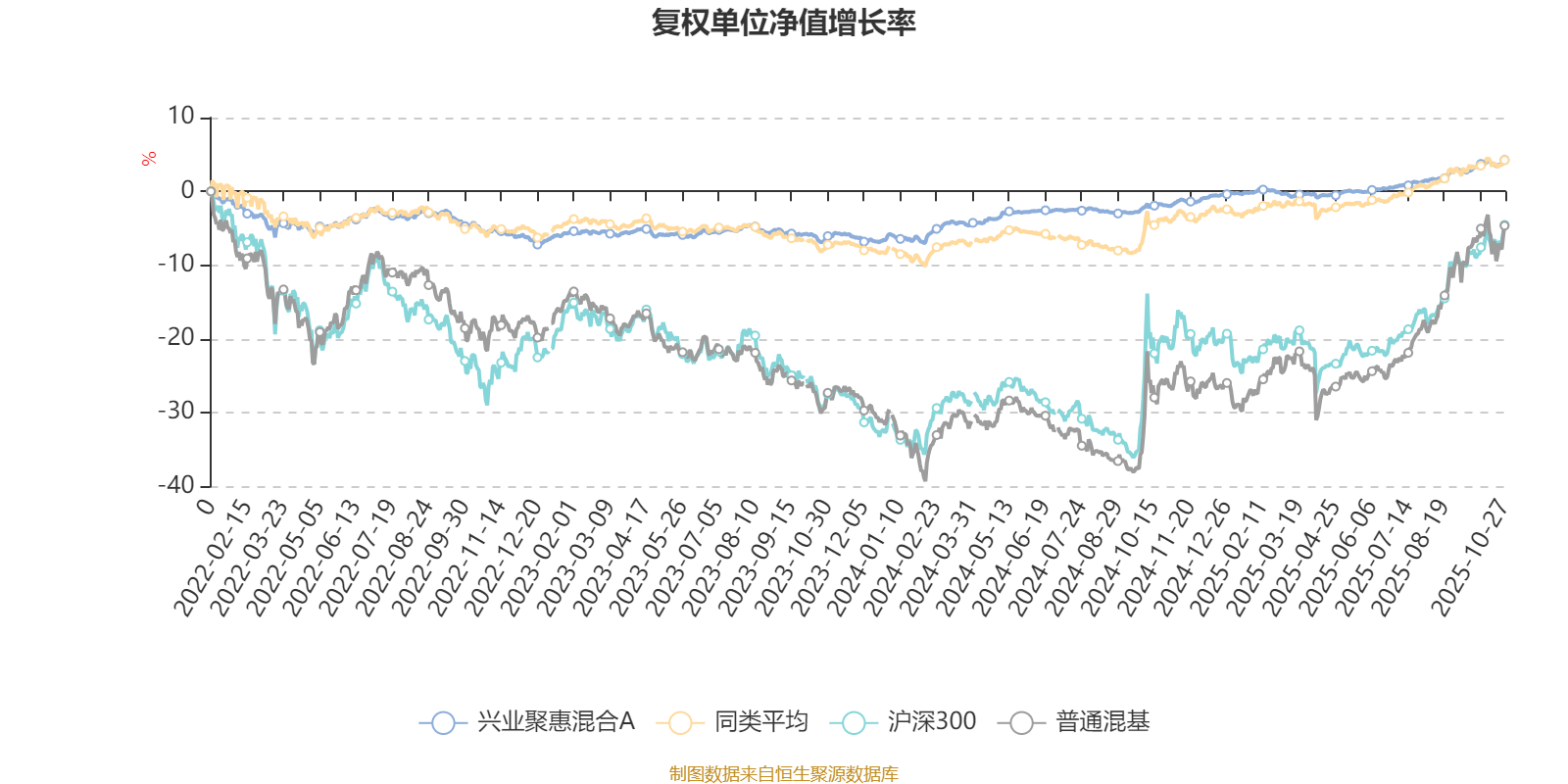 截至10月27日,兴业聚惠混合A近三个月复权单位净值增长率为3.09%,位于同类可比基金256/629;近半年复权单位净值增长率为4.81%,位于同类可比基金354/629;近一年复权单位净值增长率为6.25%,位于同类可比基金381/623;近三年复权单位净值增长率为10.26%,位于同类可比基金328/557。
