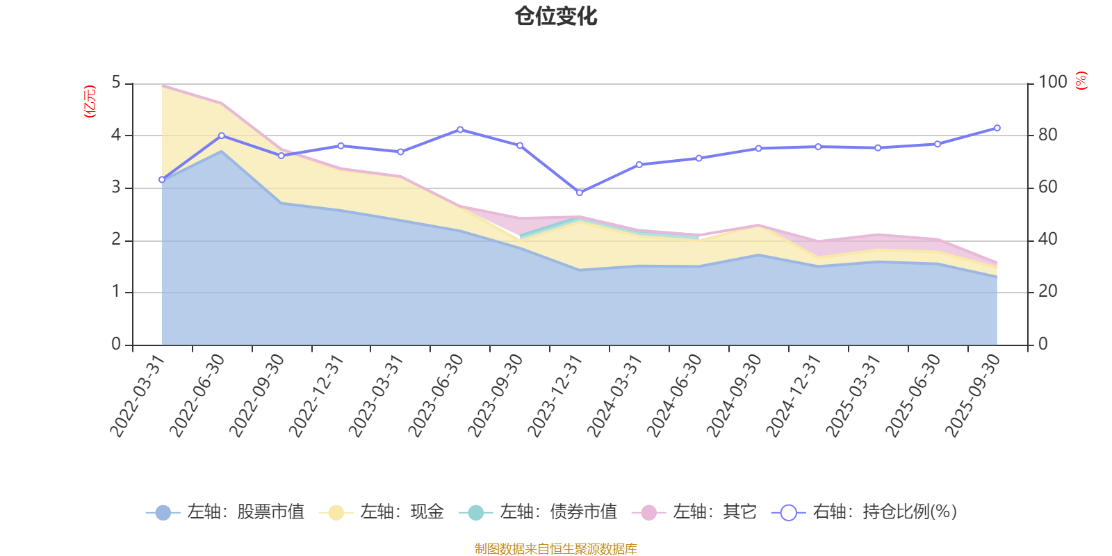 据定期报告数据统计,近三年平均股票仓位为74.44%,同类平均为72.35%。2025年三季度末基金达到82.97%的最高仓位,2023年末最低,为58.25%。