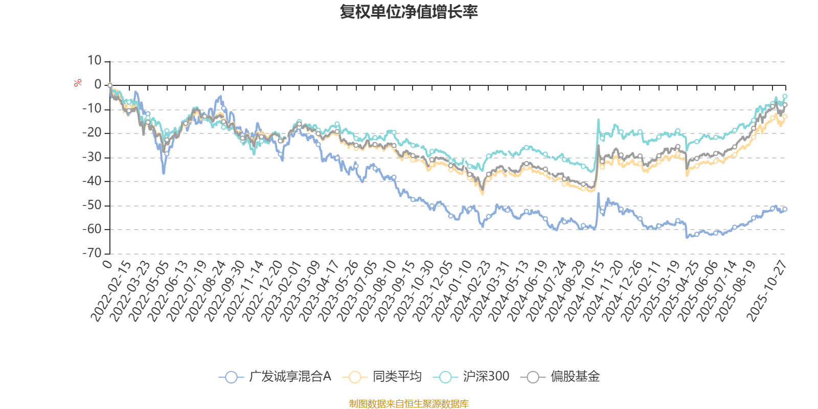 截至10月27日,广发诚享混合A近三个月复权单位净值增长率为15.10%,位于同类可比基金99/185;近半年复权单位净值增长率为27.48%,位于同类可比基金108/185;近一年复权单位净值增长率为-8.83%,位于同类可比基金181/181;近三年复权单位净值增长率为-39.15%,位于同类可比基金174/175。