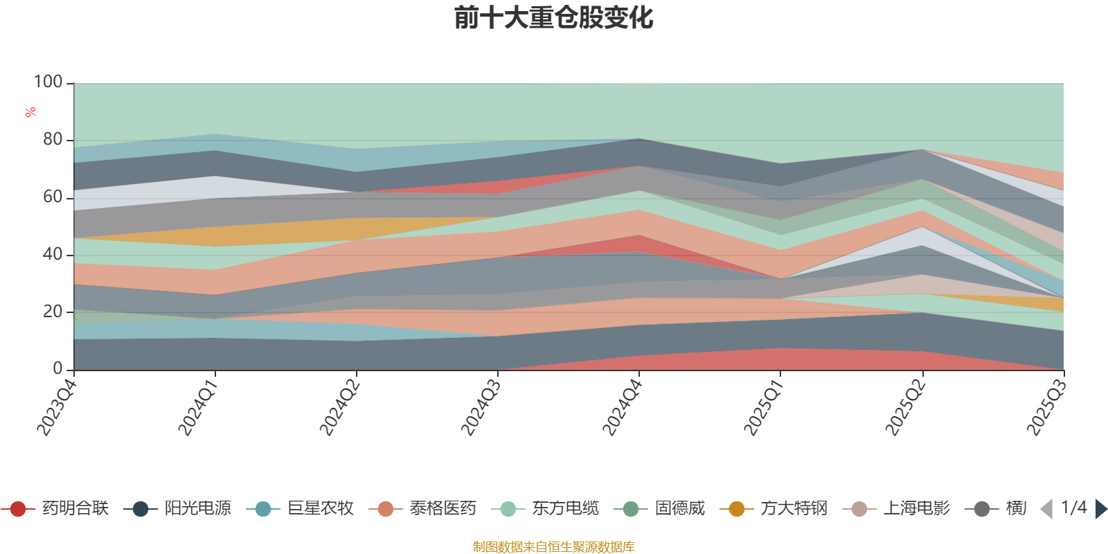 该基金持股集中度较高,近2年前十大重仓股集中度长期超过60%。截至2025年三季度末,基金十大重仓股分别是阳光电源、中天科技、东方电缆、圆通速递、华菱钢铁、晶澳科技、燕京啤酒、福莱特、方大特钢、亨通光电、福莱特玻璃。