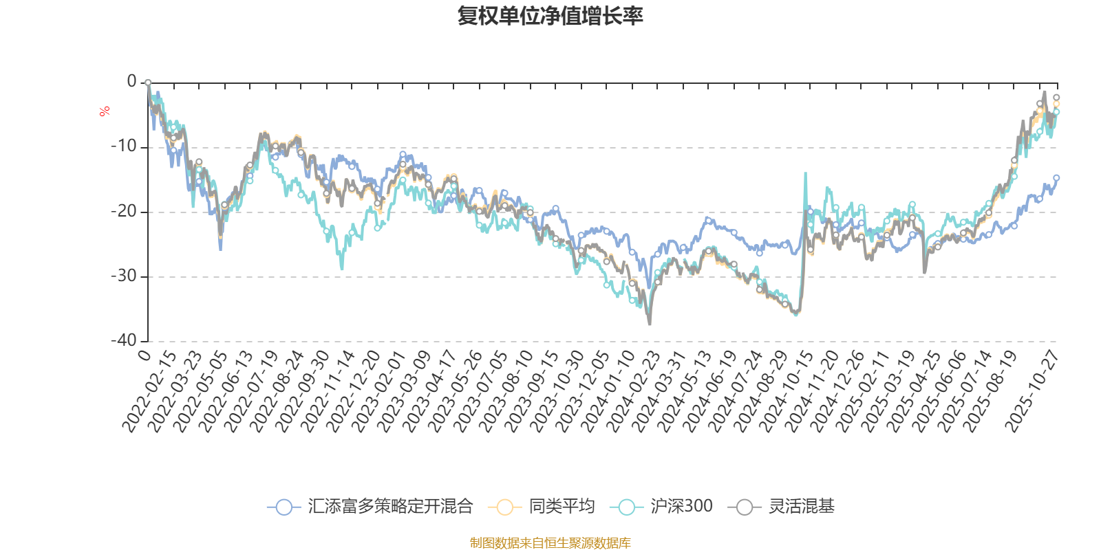 截至10月27日,汇添富多策略定开混合近三个月复权单位净值增长率为9.41%,位于同类可比基金770/1287;近半年复权单位净值增长率为13.53%,位于同类可比基金942/1287;近一年复权单位净值增长率为7.09%,位于同类可比基金1058/1287;近三年复权单位净值增长率为-3.54%,位于同类可比基金1048/1286。