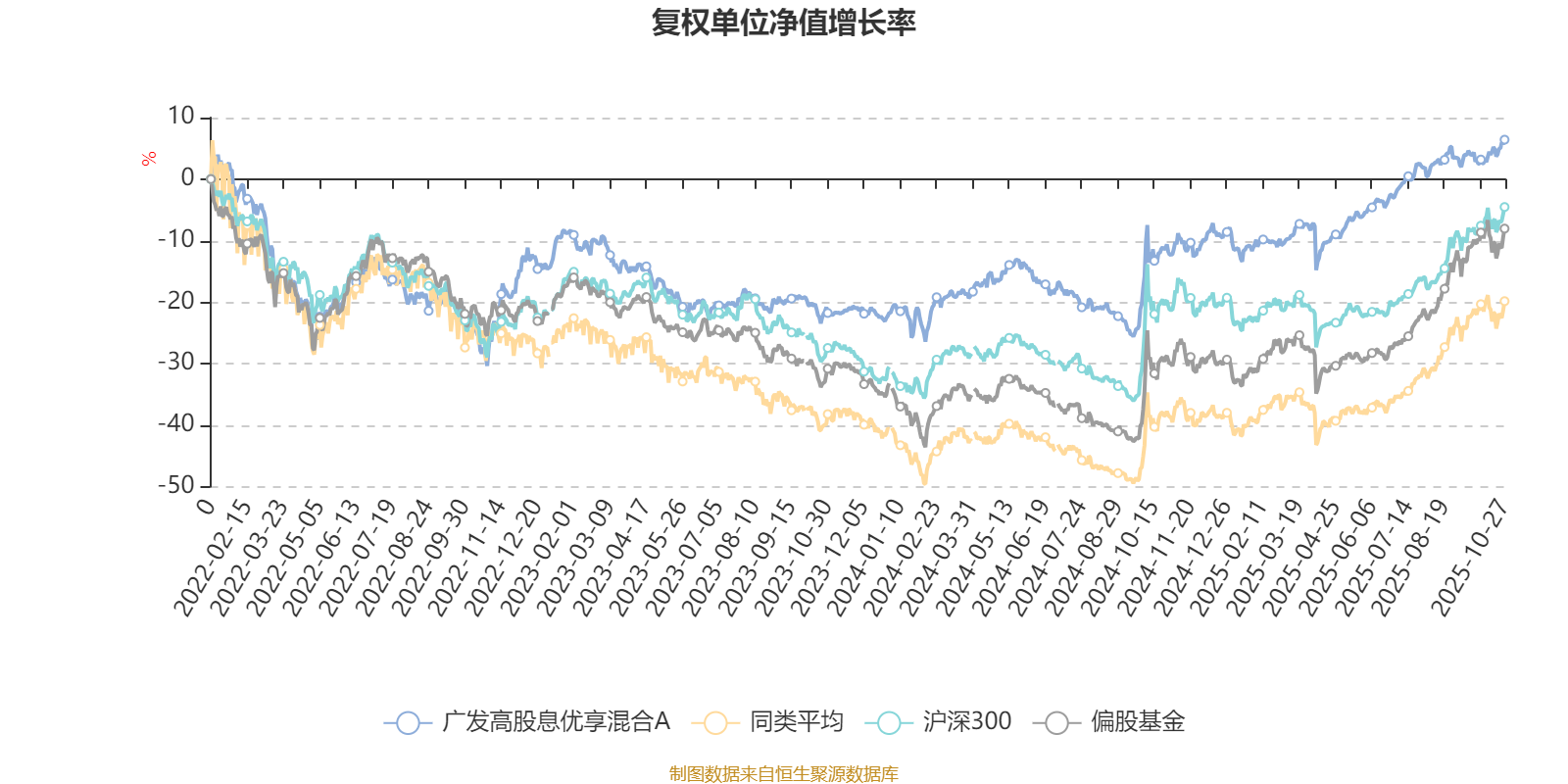 截至10月27日,广发高股息优享混合A近三个月复权单位净值增长率为4.10%,位于同类可比基金545/621;近半年复权单位净值增长率为16.94%,位于同类可比基金501/619;近一年复权单位净值增长率为19.87%,位于同类可比基金418/611;近三年复权单位净值增长率为47.23%,位于同类可比基金77/518。