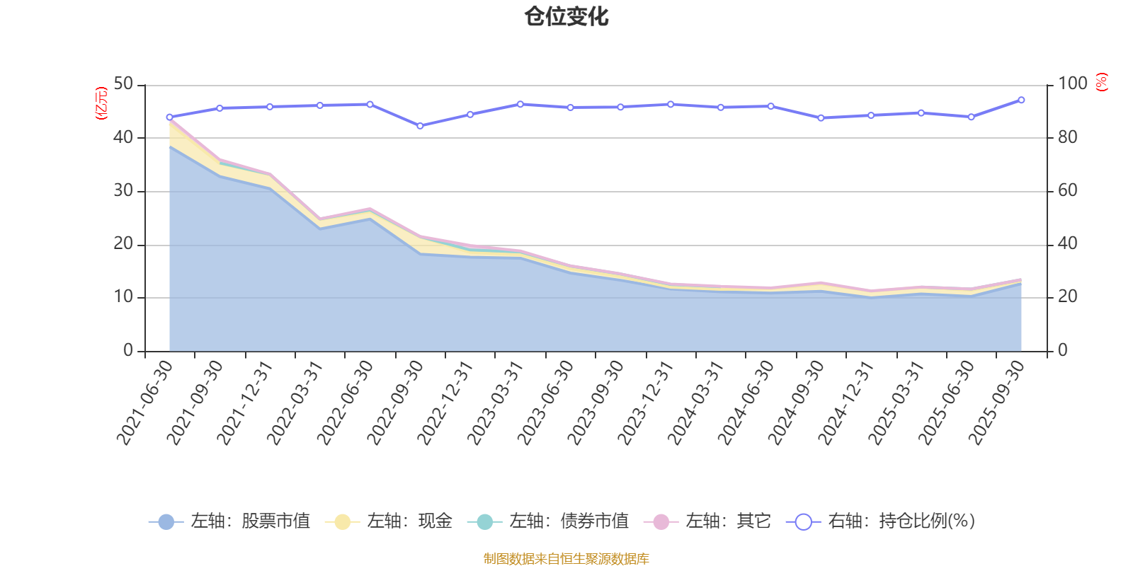 据定期报告数据统计,近三年平均股票仓位为90.76%,同类平均为87.62%。2025年三季度末基金达到94.36%的最高仓位,2022年三季度末最低,为84.62%。