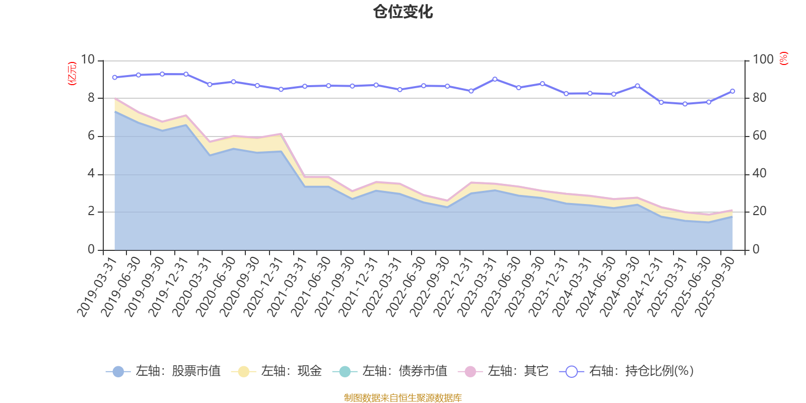 据定期报告数据统计,近三年平均股票仓位为83.2%,同类平均为85.66%。2019年三季度末基金达到92.83%的最高仓位,2025年一季度末最低,为77.07%。