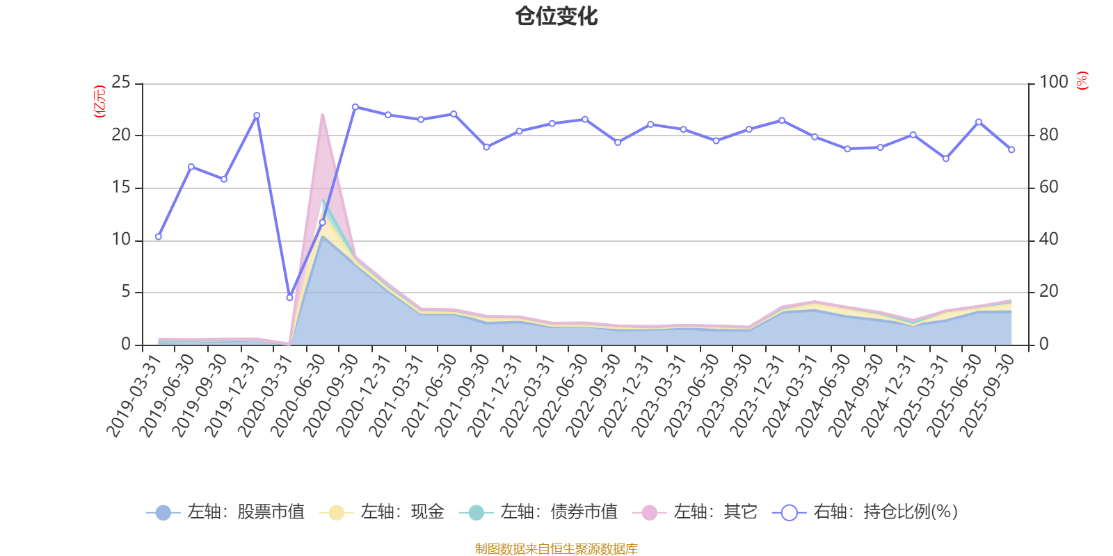 据定期报告数据统计,近三年平均股票仓位为79.57%,同类平均为72.35%。2020年三季度末基金达到91.03%的最高仓位,2020年一季度末最低,为18.12%。