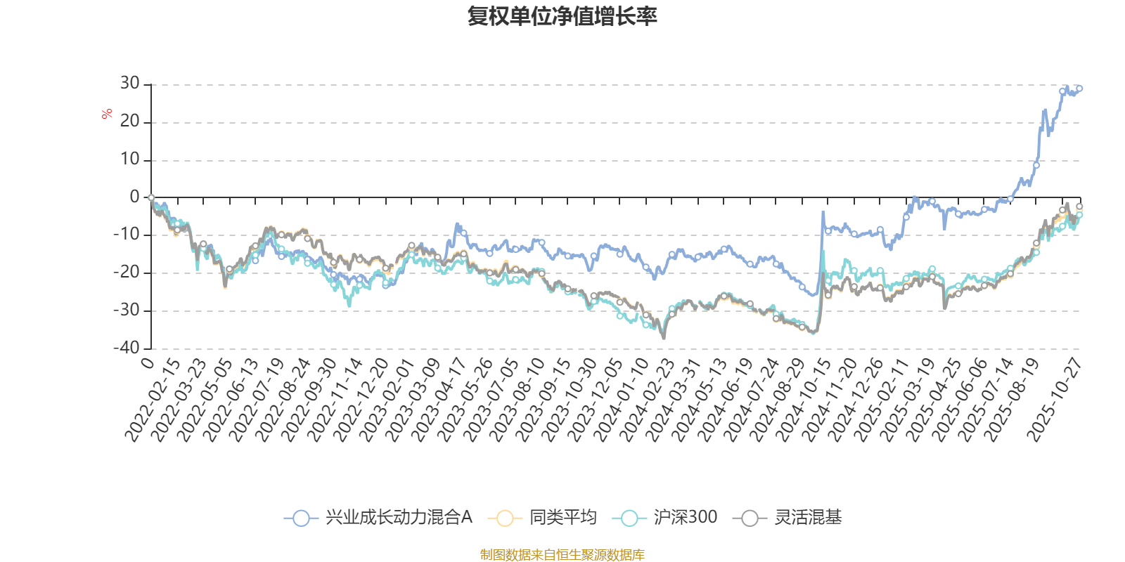 截至10月27日,兴业成长动力混合A近三个月复权单位净值增长率为23.98%,位于同类可比基金303/1287;近半年复权单位净值增长率为34.70%,位于同类可比基金382/1287;近一年复权单位净值增长率为40.39%,位于同类可比基金257/1287;近三年复权单位净值增长率为64.34%,位于同类可比基金76/1286。