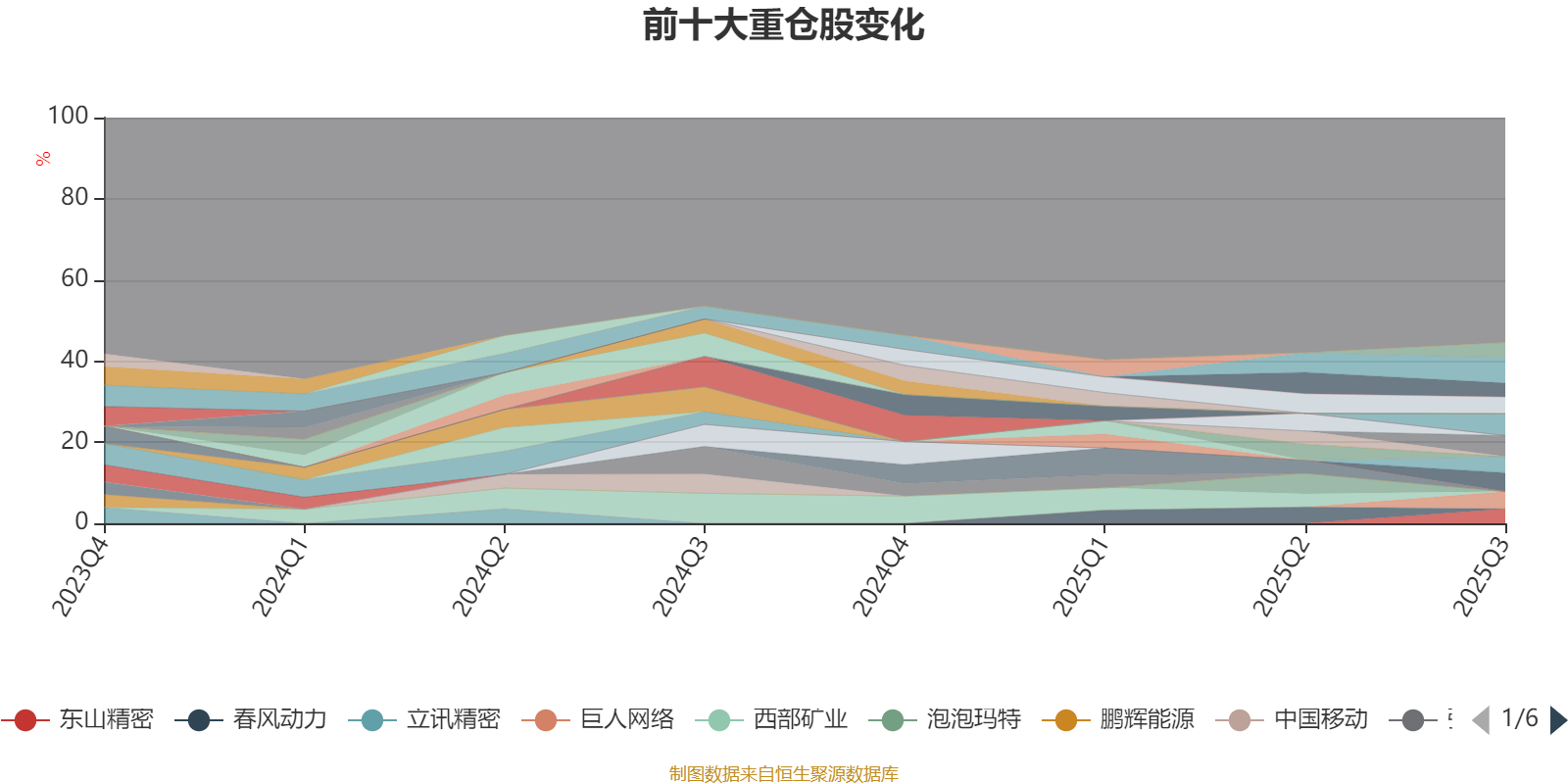 截至2025年三季度末,基金十大重仓股分别是欣旺达、寒武纪、中国黄金国际、中金黄金、巨人网络、英维克、菲利华、山东黄金、东山精密、理想汽车-W。