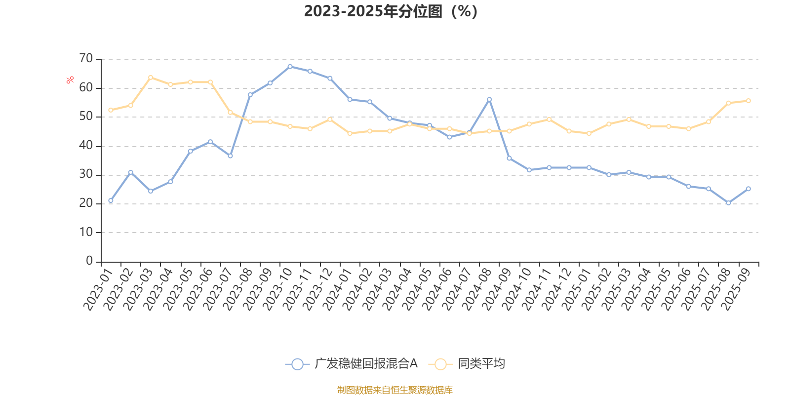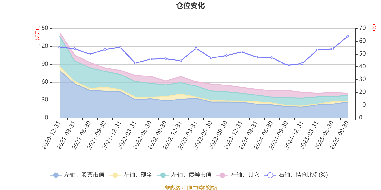 据定期报告数据统计,近三年平均股票仓位为49.7%,同类平均为67.37%。2025年三季度末基金达到63.92%的最高仓位,2024年三季度末最低,为41.19%。
