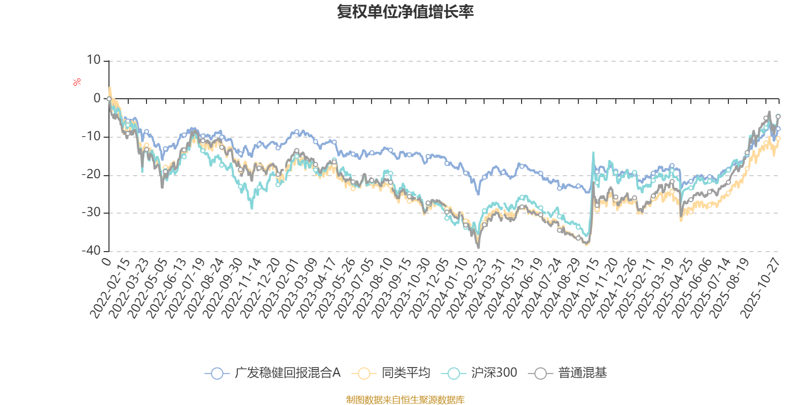 截至10月27日,广发稳健回报混合A近三个月复权单位净值增长率为11.39%,位于同类可比基金68/134;近半年复权单位净值增长率为17.63%,位于同类可比基金77/134;近一年复权单位净值增长率为12.23%,位于同类可比基金92/130;近三年复权单位净值增长率为7.65%,位于同类可比基金89/119。