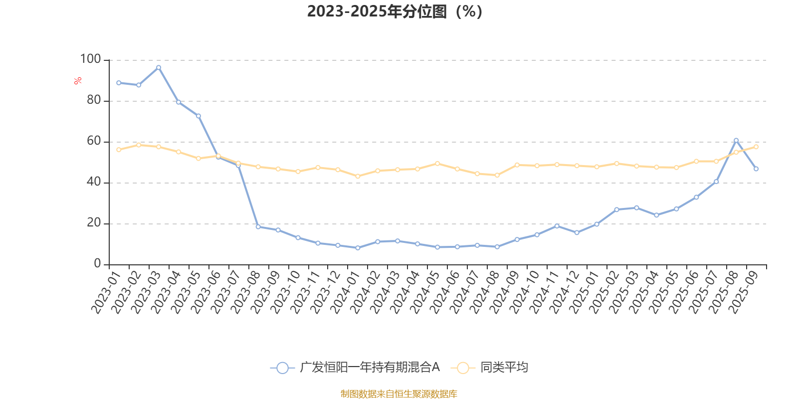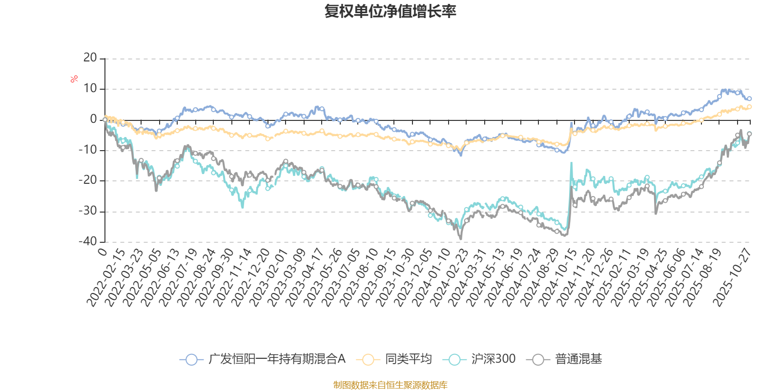 截至10月27日,广发恒阳一年持有期混合A近三个月复权单位净值增长率为1.51%,位于同类可比基金438/629;近半年复权单位净值增长率为6.49%,位于同类可比基金244/629;近一年复权单位净值增长率为10.13%,位于同类可比基金148/623;近三年复权单位净值增长率为5.36%,位于同类可比基金460/557。