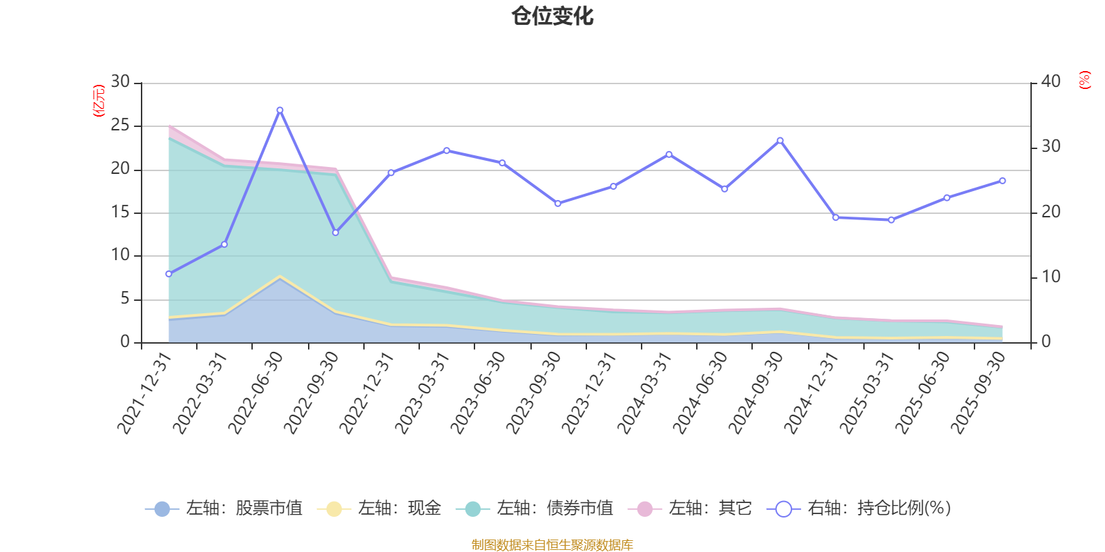 据定期报告数据统计,近三年平均股票仓位为24.83%,同类平均为19.14%。2022年上半年末基金达到35.8%的最高仓位,2021年末最低,为10.58%。