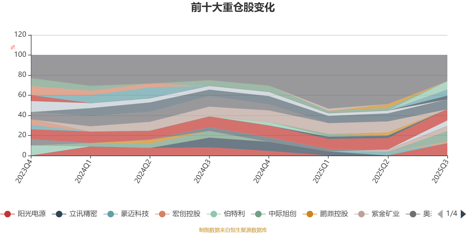 截至2025年三季度末,基金十大重仓股分别是阳光电源、宁德时代、中际旭创、思源电气、新易盛、工业富联、ST华通、紫金矿业、巨化股份、宏创控股。