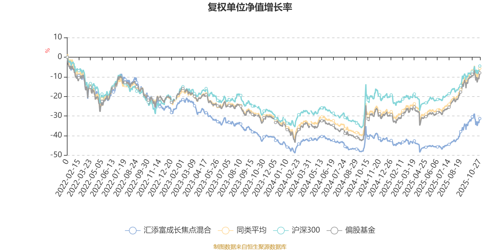 截至10月27日,汇添富成长焦点混合近三个月复权单位净值增长率为20.72%,位于同类可比基金53/130;近半年复权单位净值增长率为27.09%,位于同类可比基金73/130;近一年复权单位净值增长率为14.79%,位于同类可比基金105/130;近三年复权单位净值增长率为-9.94%,位于同类可比基金120/124。