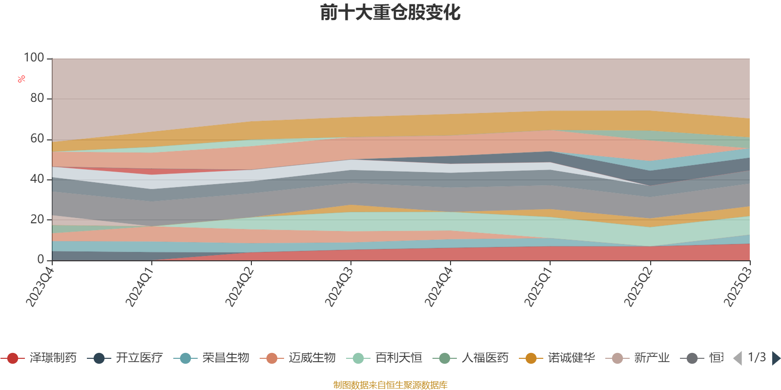 该基金持股集中度较高。截至2025年三季度末,基金十大重仓股分别是恒瑞医药、海思科、百利天恒、泽璟制药、信立泰、新诺威、热景生物、诺诚健华、益方生物、荣昌生物。