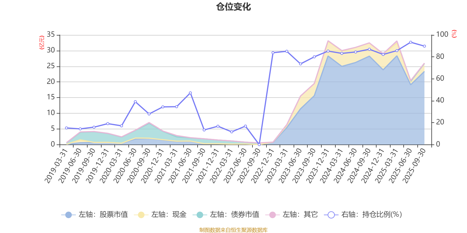 据定期报告数据统计,近三年平均股票仓位为84.46%,同类平均为72.35%。2025年上半年末基金达到93.37%的最高仓位,2022年一季度末最低,为11.65%。