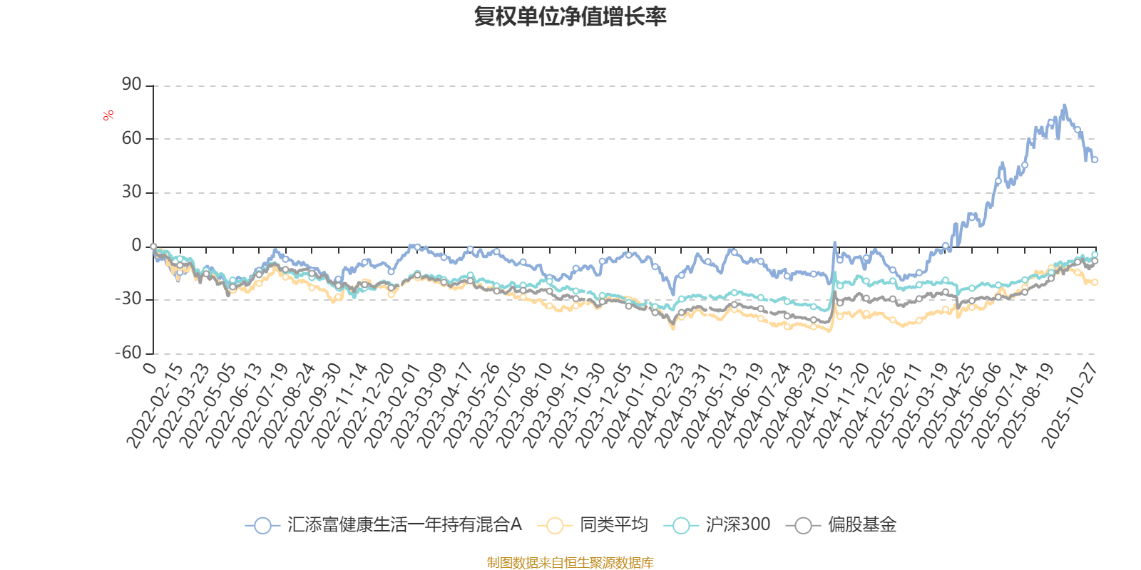 截至10月27日,汇添富健康生活一年持有混合A近三个月复权单位净值增长率为-3.96%,位于同类可比基金66/106;近半年复权单位净值增长率为27.86%,位于同类可比基金27/104;近一年复权单位净值增长率为56.94%,位于同类可比基金6/101;近三年复权单位净值增长率为68.95%,位于同类可比基金1/75。