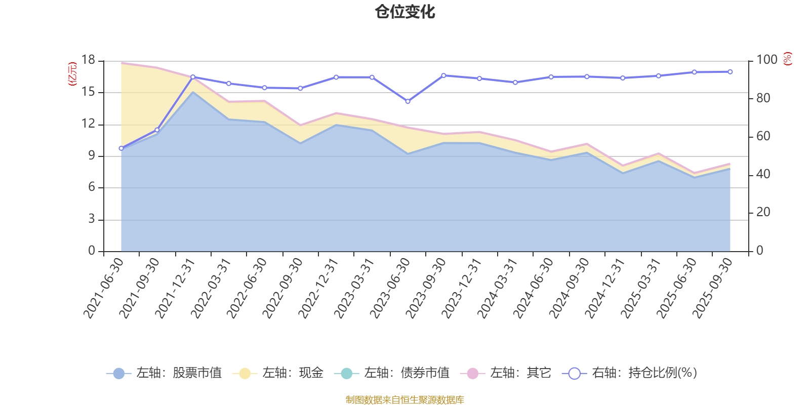 据定期报告数据统计,近三年平均股票仓位为90.62%,同类平均为86.94%。2025年三季度末基金达到94.21%的最高仓位,2021年上半年末最低,为54.08%。