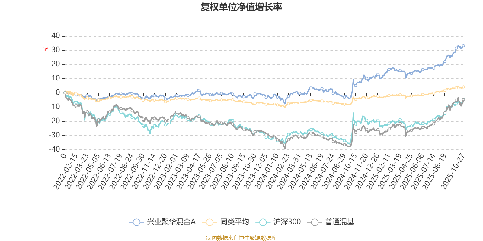 截至10月27日,兴业聚华混合A近三个月复权单位净值增长率为11.58%,位于同类可比基金15/629;近半年复权单位净值增长率为17.25%,位于同类可比基金21/629;近一年复权单位净值增长率为24.08%,位于同类可比基金14/623;近三年复权单位净值增长率为38.27%,位于同类可比基金5/557。