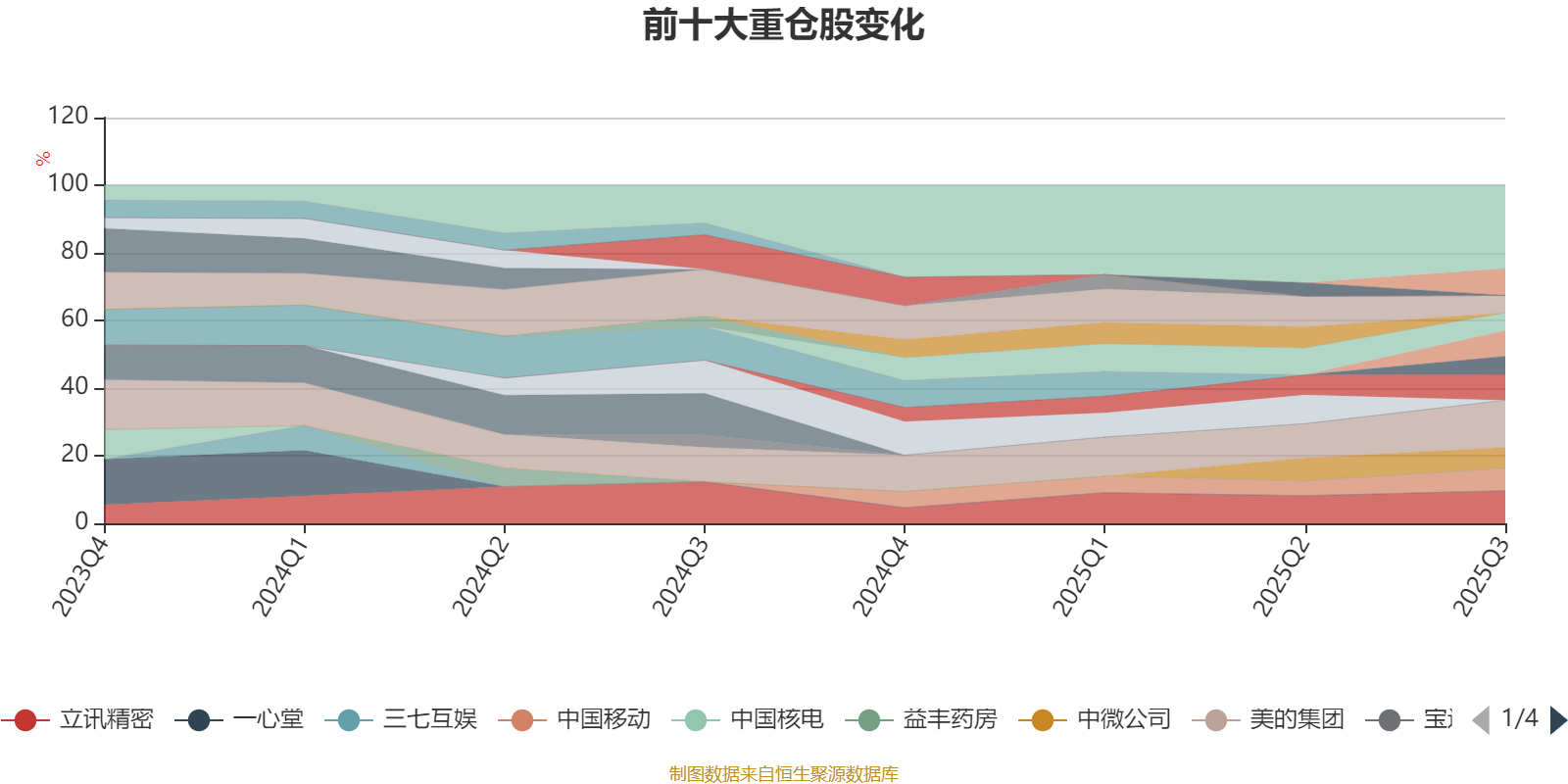 该基金持股集中度较高,近2年前十大重仓股集中度长期超过60%。截至2025年三季度末,基金十大重仓股分别是美的集团、立讯精密、浪潮信息、迈瑞医疗、通富微电、中国移动、中微公司、汇川技术、圣邦股份、歌尔股份。
