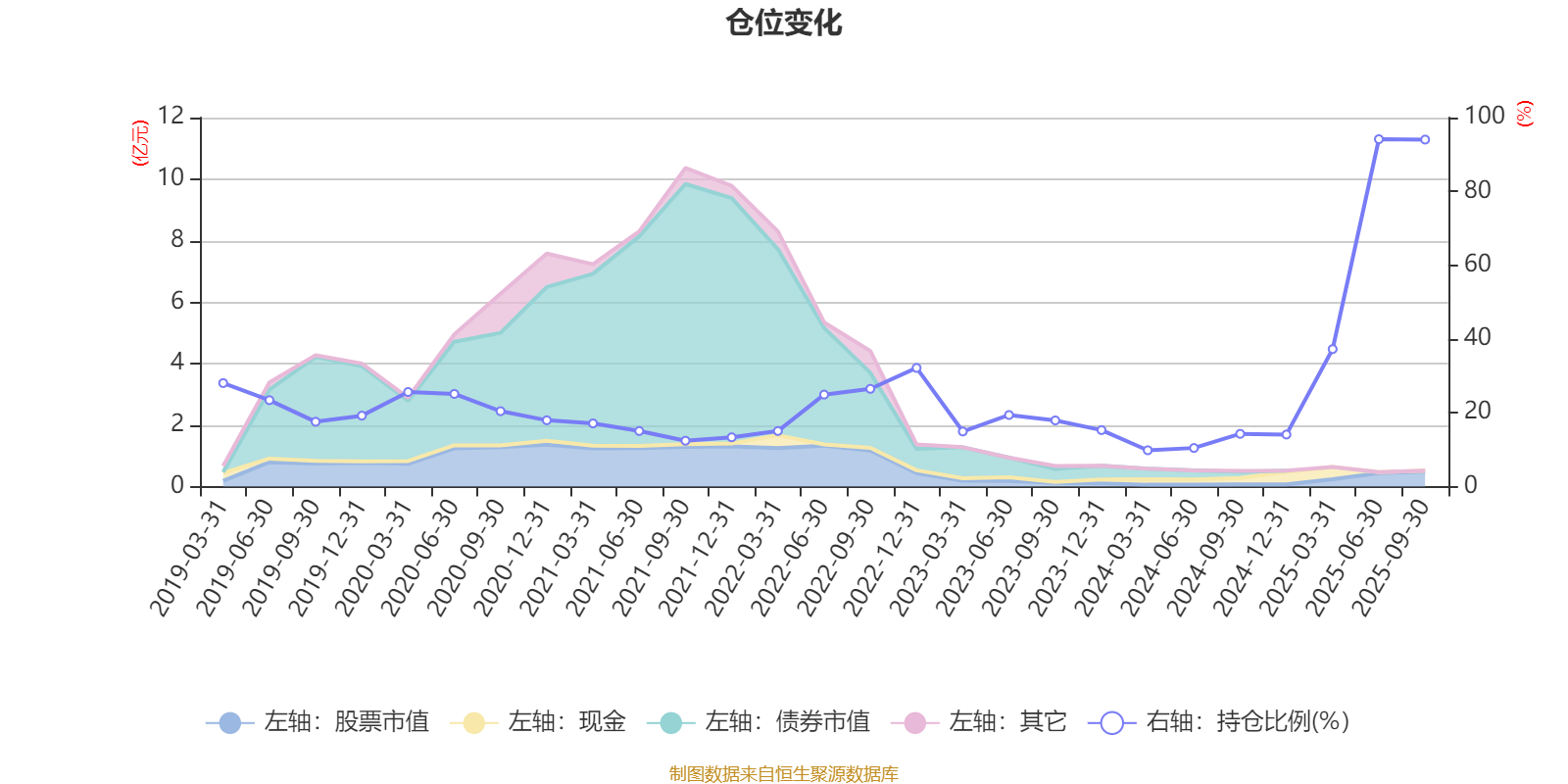 据定期报告数据统计,近三年平均股票仓位为31.16%,同类平均为72.35%。2025年上半年末基金达到94.15%的最高仓位,2024年一季度末最低,为9.84%。