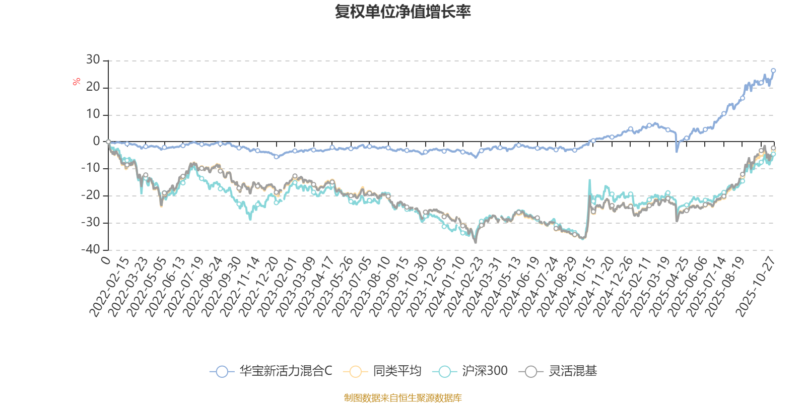 截至10月27日,华宝新活力混合C近三个月复权单位净值增长率为11.23%,位于同类可比基金691/1287;近半年复权单位净值增长率为24.60%,位于同类可比基金621/1287;近一年复权单位净值增长率为24.75%,位于同类可比基金576/1287;近三年复权单位净值增长率为29.99%,位于同类可比基金346/1286。