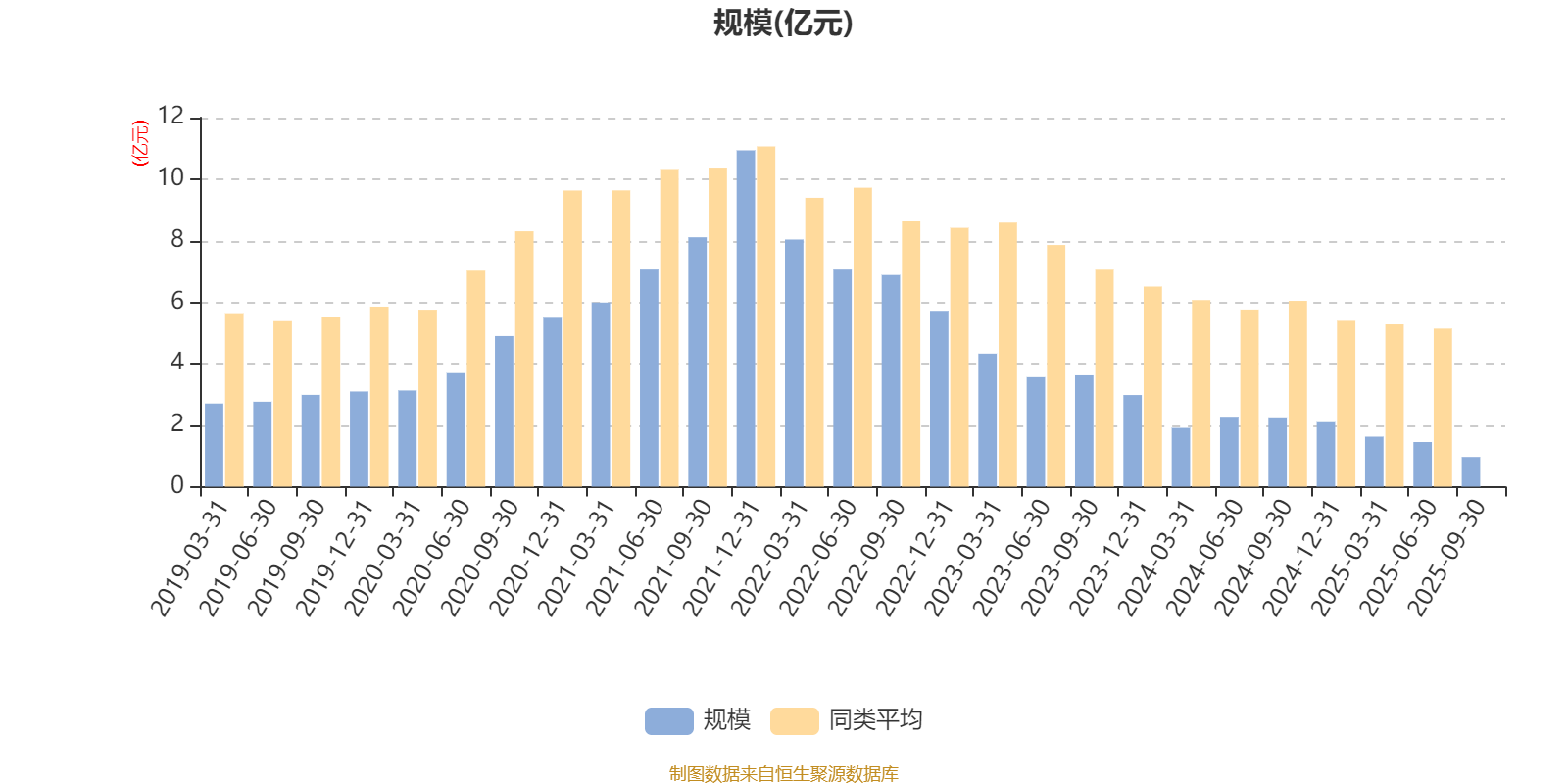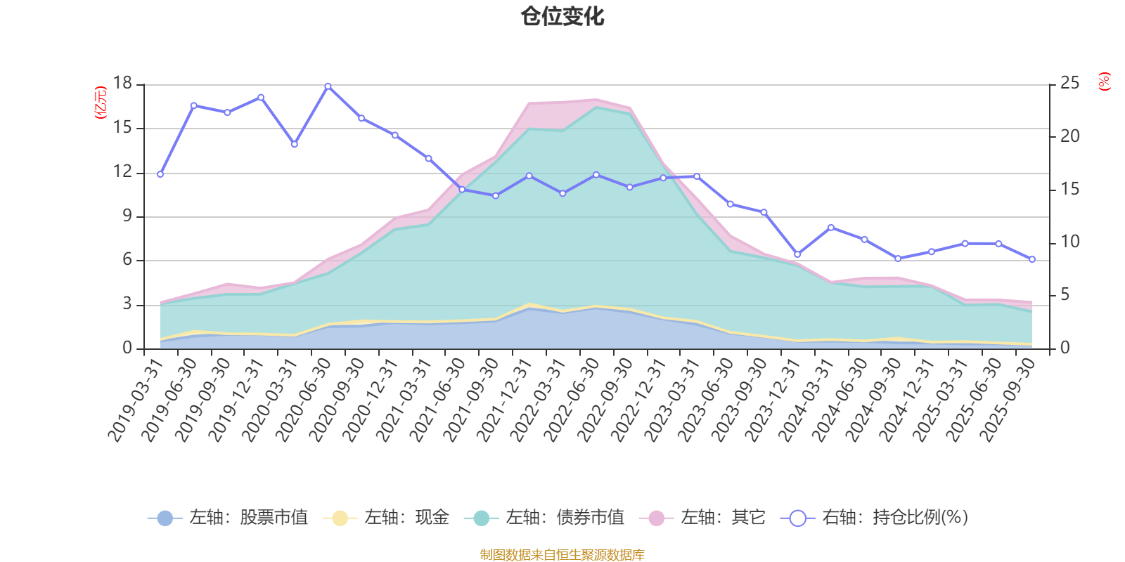 据定期报告数据统计,近三年平均股票仓位为11.32%,同类平均为72.35%。2020年上半年末基金达到24.81%的最高仓位,2025年三季度末最低,为8.46%。