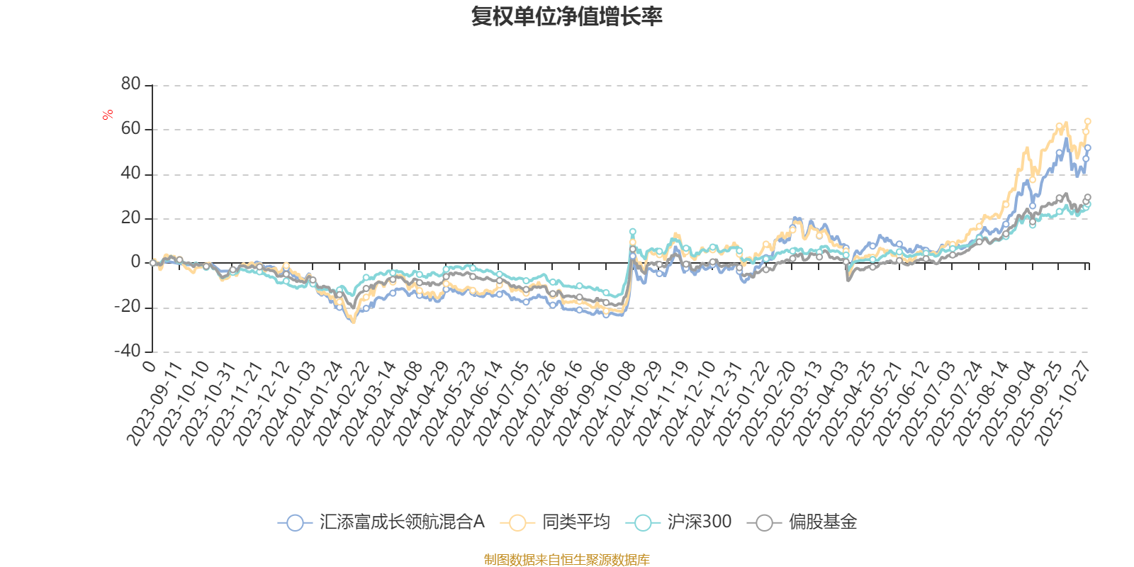 截至10月27日,汇添富成长领航混合A近三个月复权单位净值增长率为33.83%,位于同类可比基金130/229;近半年复权单位净值增长率为41.06%,位于同类可比基金165/229;近一年复权单位净值增长率为57.27%,位于同类可比基金97/213。