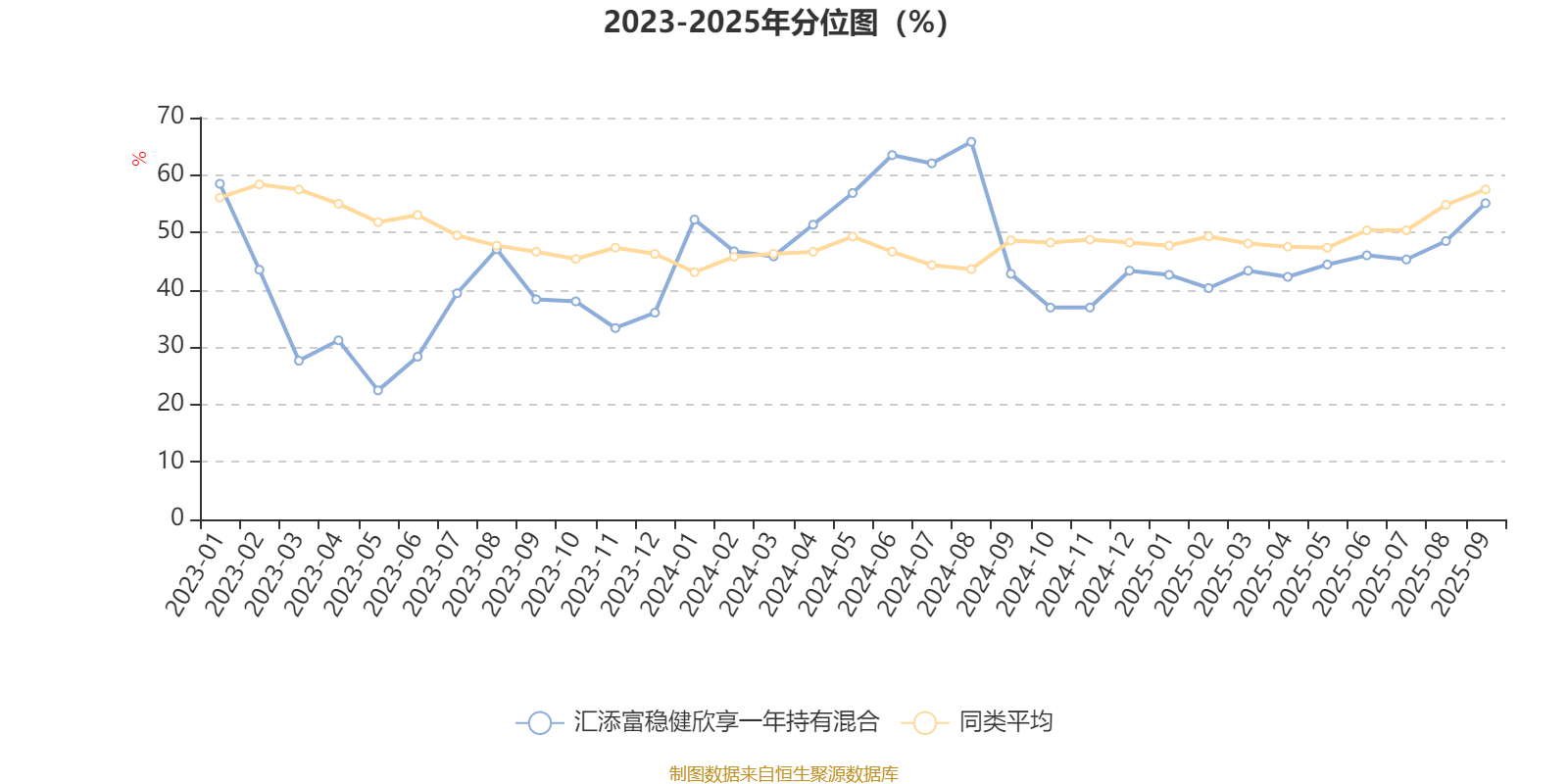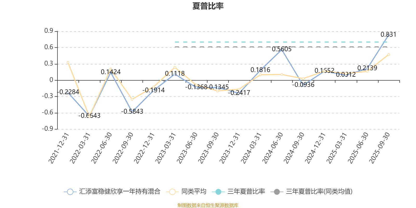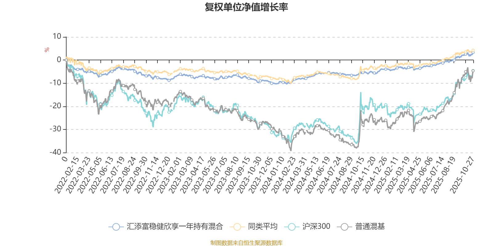截至10月27日,汇添富稳健欣享一年持有混合近三个月复权单位净值增长率为4.08%,位于同类可比基金174/629;近半年复权单位净值增长率为7.11%,位于同类可比基金203/629;近一年复权单位净值增长率为9.29%,位于同类可比基金181/623;近三年复权单位净值增长率为12.03%,位于同类可比基金255/557。