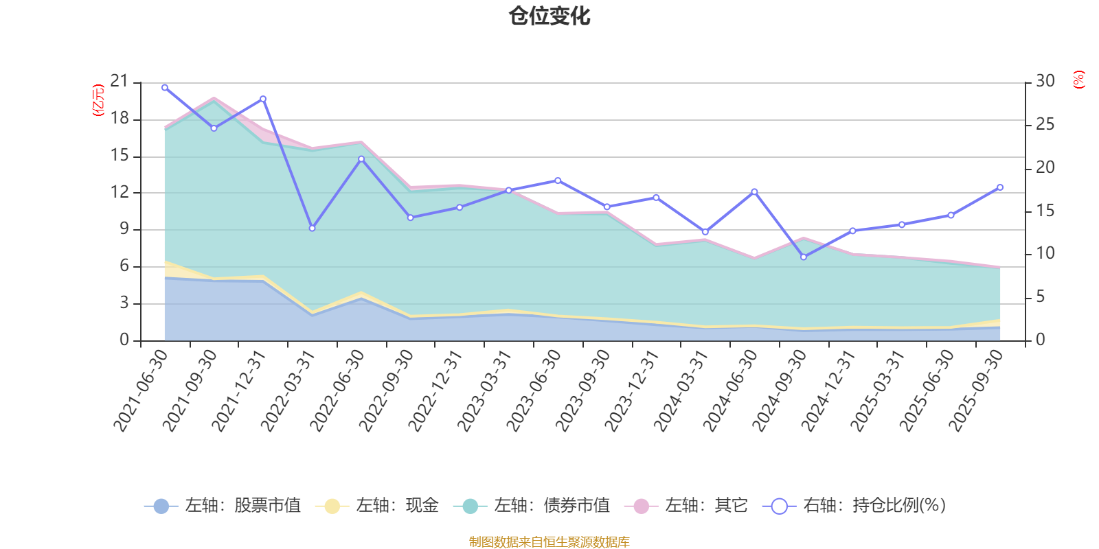 据定期报告数据统计,近三年平均股票仓位为15.17%,同类平均为19.14%。2021年上半年末基金达到29.4%的最高仓位,2024年三季度末最低,为9.72%。