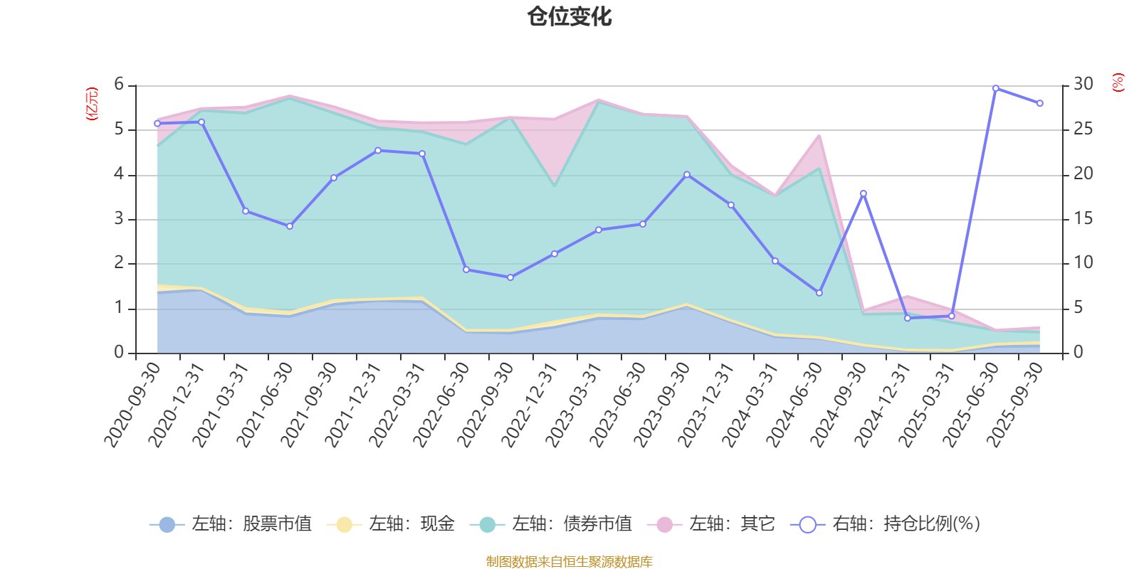 据定期报告数据统计,近三年平均股票仓位为14.73%,同类平均为19.14%。2025年上半年末基金达到29.67%的最高仓位,2024年末最低,为3.92%。