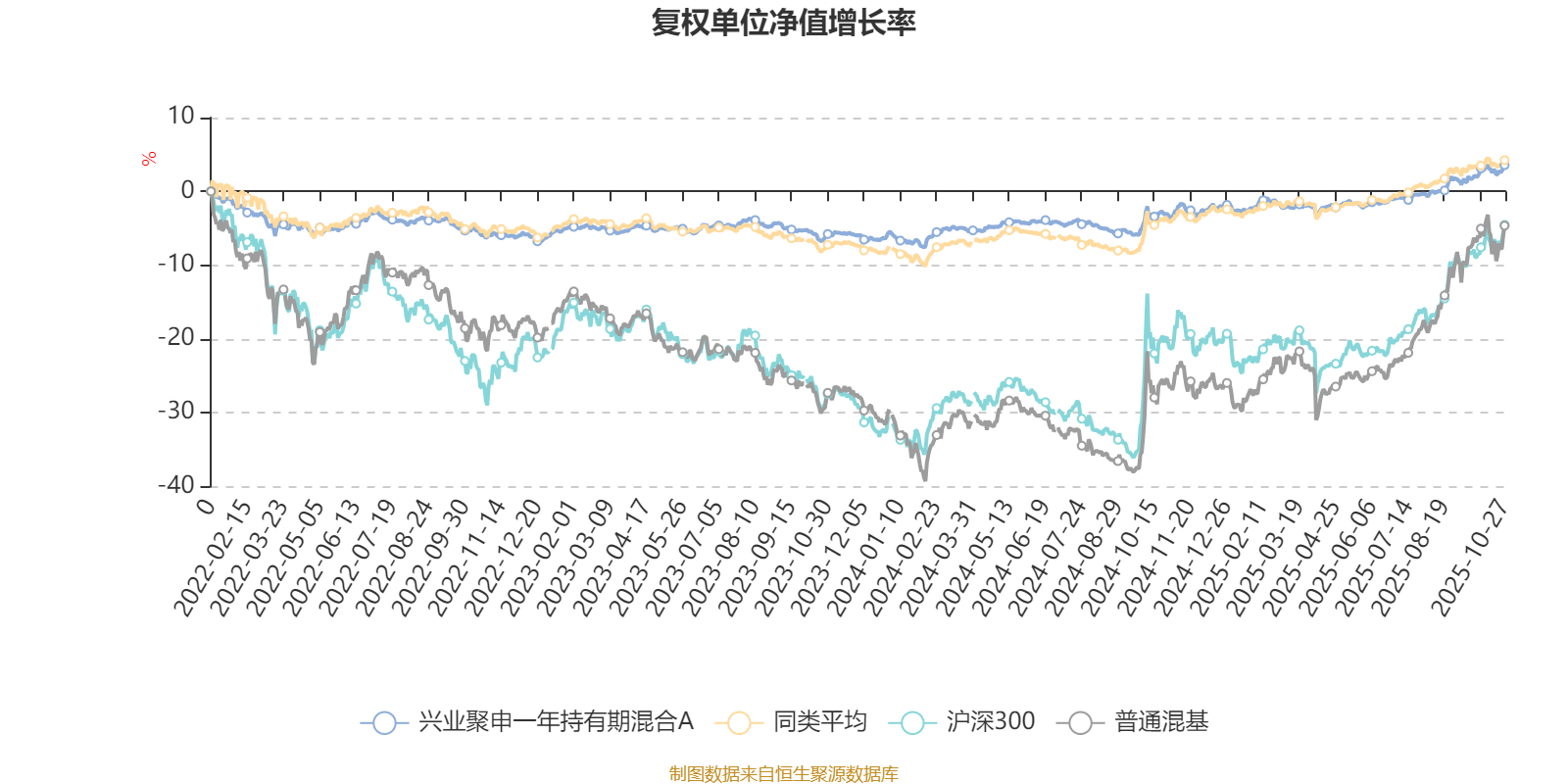 截至10月27日,兴业聚申一年持有期混合A近三个月复权单位净值增长率为3.98%,位于同类可比基金182/629;近半年复权单位净值增长率为5.85%,位于同类可比基金288/629;近一年复权单位净值增长率为6.84%,位于同类可比基金333/623;近三年复权单位净值增长率为10.19%,位于同类可比基金334/557。