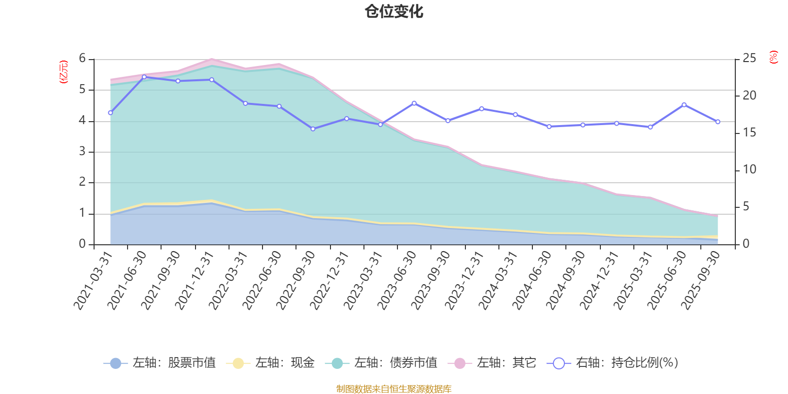 据定期报告数据统计,近三年平均股票仓位为17.03%,同类平均为19.14%。2021年上半年末基金达到22.6%的最高仓位,2022年三季度末最低,为15.59%。
