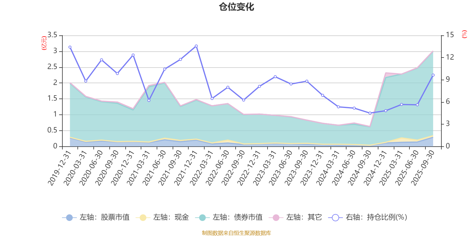 据定期报告数据统计,近三年平均股票仓位为6.88%,同类平均为72.35%。2021年末基金达到13.57%的最高仓位,2024年三季度末最低,为4.51%。