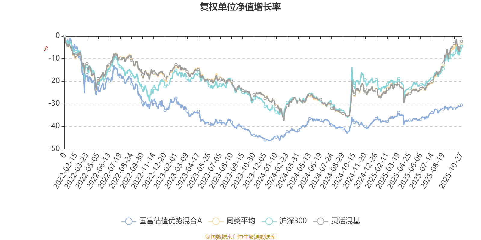 截至10月27日,国富估值优势混合A近三个月复权单位净值增长率为2.94%,位于同类可比基金1043/1287;近半年复权单位净值增长率为10.59%,位于同类可比基金1016/1287;近一年复权单位净值增长率为12.70%,位于同类可比基金870/1287;近三年复权单位净值增长率为-0.26%,位于同类可比基金998/1286。
