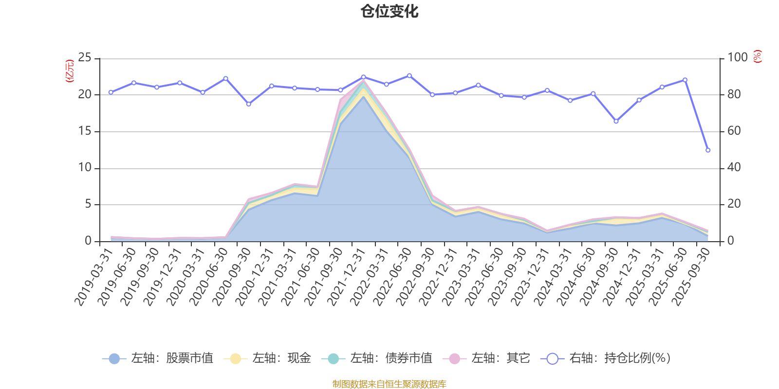 据定期报告数据统计,近三年平均股票仓位为77.54%,同类平均为72.35%。2022年上半年末基金达到90.54%的最高仓位,2025年三季度末最低,为49.87%。